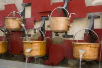 No muy lejos, entre el Paseo Cuellar y la calle de José Pellicer se localiza una pequeña plaza de encuentro ciudadano amenizada por la presencia de La fuente de los Calderos (1989) de Rafael Barnola. Está compuesta por nueve calderos colgados de ganchos de hierro, de los cuales cae agua a una pila rectangular construida en piedra. Esta pieza destaca por el homenaje a la cultura popular a través del uso de material reciclado, como son estos calderos utilizados para la matanza del cerdo. Pero también es una instalación que se hace eco de la estética del arte póvera italiano y de otros movimientos renovadores de los años setenta. Asimismo, esta plaza es un ejemplo de la creación de pequeños espacios ciudadanos para el esparcimiento de los vecinos que se prodigaron en los años ochenta en Zaragoza en entornos dominados por el tráfico y la carencia de zonas de recreo.