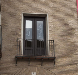 Volviendo a nuestro itinerario, llegaremos a la calle de Predicadores donde localizamos un mural realizado por la artista Eme para el Festival Asalto en su séptima edición (2012) y también de este asalto, en la calle Broqueleros, hay que señalar el trabajo de Vworkshop , un colectivo de artistas formado por Joan Tarragó y Marga López. Es en Predicadores donde se ubica el Albergue Juvenil Municipal, que en su puerta luce otra de las Intervenciones en cristales de Susana Vacas , de las mismas características que las vistas antes en las ventanas del Colegio de Arquitectos de Aragón de la Plaza Ariño, pero en este caso se trata de una sola silueta, un personaje cabeza abajo y musculoso, como en algunas de sus Intervenciones en la fachada del Teatro de las Esquinas, que sugieren la danza, el teatro o la gimnasia, actividades entre otras muchas culturales que se realizan en el interior de ese edificio.