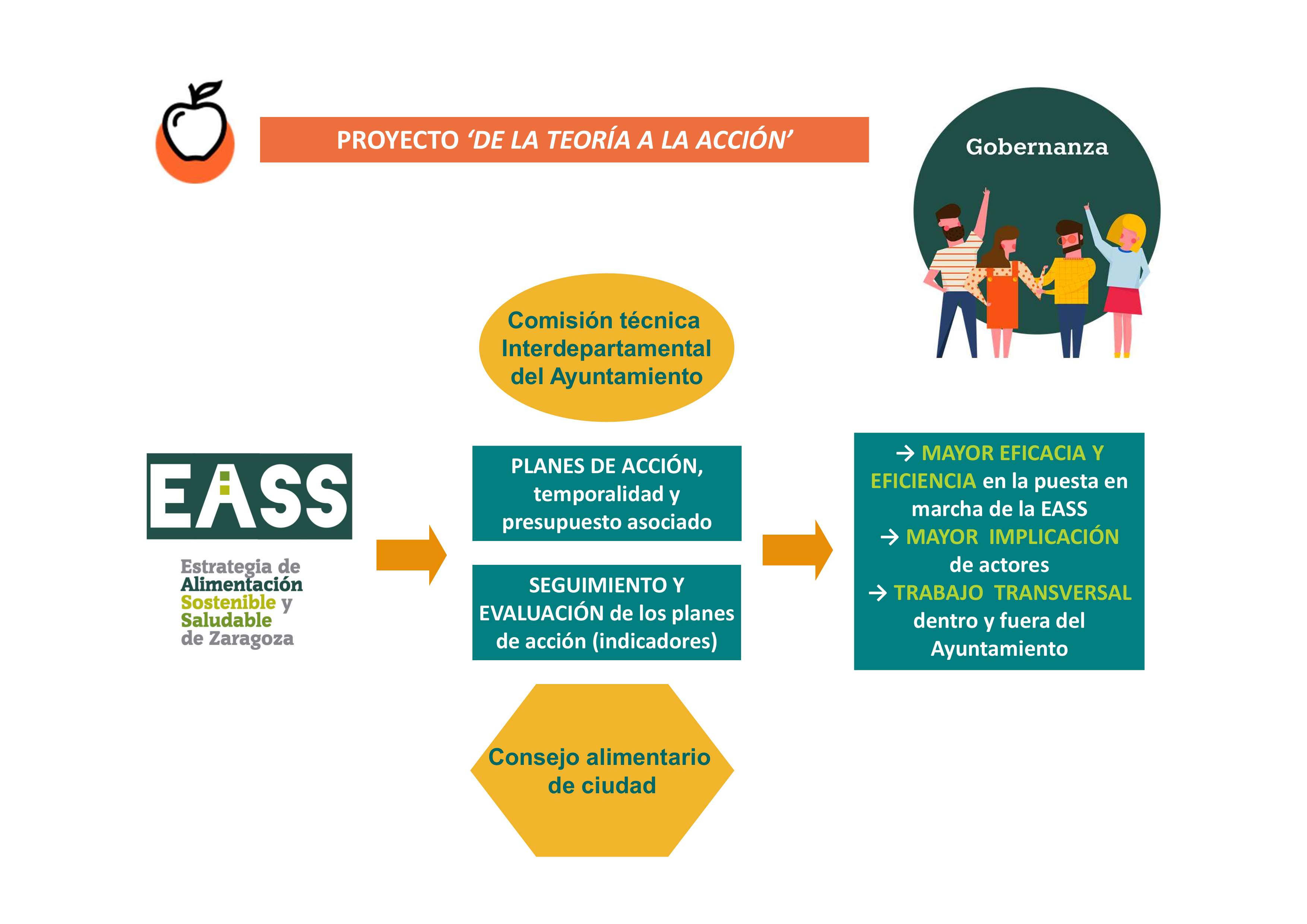 Una vez elaborada la Estrategia, resulta necesario definir planes de acción que concreten las actuaciones a desarrollar en un marco temporal de 3 años. El proyecto pretende hacerlo a través de distintas acciones de gobernanza. Para ello está prevista la implementación de dos espacios: una nueva Comisión Técnica Interdepartamental, con la implicación de todas las áreas municipales relacionadas con las políticas alimentarias, y el Consejo Alimentario, impulsándolo, ampliando sus miembros y buscando formas innovadoras de funcionamiento.