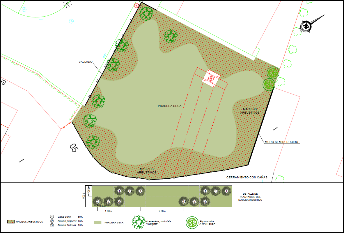 Se propone una zona central con pradera seca y en los bordes de la parcela, con formas sinuosas, se diseña un macizo arbustivo continuo en el que se incluye algún árbol. Las especies arbóreas se reservan para una pequeña banda junto al vallado que limita con la calle Isla de Mallorca.