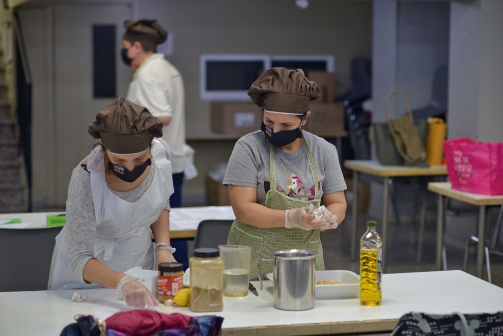 Los veinte participantes, organizados en dos grupos, han sido derivados por las entidades sociales. A través de cuatro sesiones formativas, y tras abordar los criterios principales que rigen una alimentación saludable y sostenible, elaboran menú con productos que estas personas tienen al alcance en su día a día. Además cocinan in situ algunas preparaciones menos conocidas, como por ejemplo algunas que les ayuden a incrementar el porcentaje de proteína vegetal (legumbres de producción nacional principalmente).