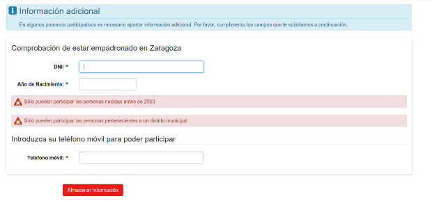 - Paso 2 - Para poder verificar tu cuenta de participación necesitamos comprobar que está empadronado/a en Zaragoza y que tiene más de 14 años: tiene que aportar su nº de DNI, NIE o pasaporte y su año de nacimiento. Durante este paso se comprueba contra las bases de datos del padrón municipal que la información introducida pertenece a un ciudadano o ciudadana mayor de 14 años, que está empadronado/a en la ciudad al día 7 de junio de 2018, fecha de inicio de la presentación del proceso “Presupuestos Participativos”.