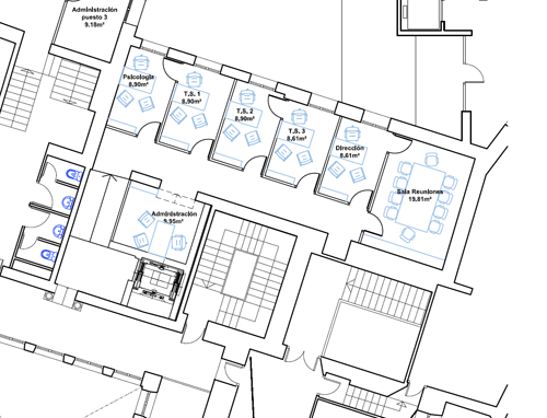 En planta baja, parte de las dependencias situadas al noreste se redistribuyen para obtener cuatro nuevos despachos. Se modifica la mampara central existente y se construyen nuevas divisiones mediante tabiquería de cartón yeso, con huecos de ventana fijos hacia el pasillo con el fin de obtener luz hacia la sala de educadores.