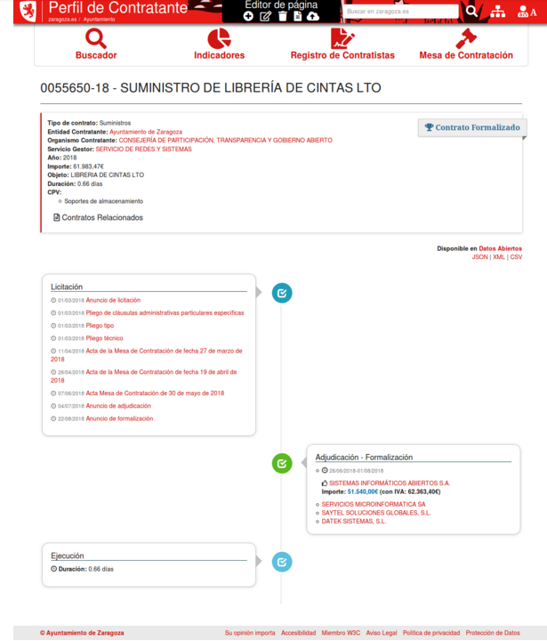 Siguiendo su calendario previsto, el Ayuntamiento de Zaragoza está trabajando en la normalización de la API de datos de Zaragoza con el Core API definido en el proyecto, se están desarrollando los servicios de visualización tanto de contratos como de facturas y sus cuadros de mando con sus indicadores respectivos. Próximamente se va a iniciar junto con los servicios gestores/supervisores la definición de las funcionalidades necesarias para la creación de una gestión que facilite tanto la elaboración de pliegos como la detección interna de anomalías en el proceso de contratación.