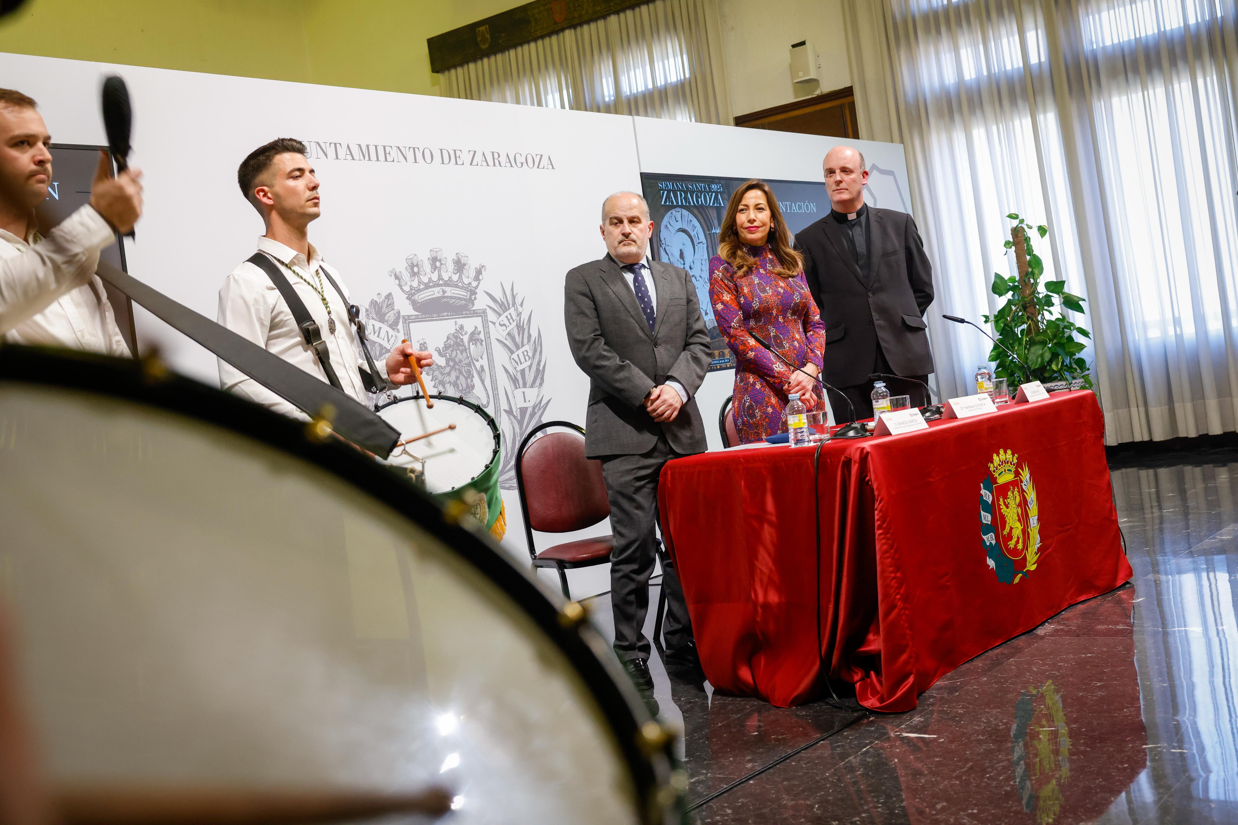 El Ayuntamiento de Zaragoza ha acogido este martes la presentación oficial de la Semana Santa 2025 en un acto en el salón de recepciones que ha contado con la presencia de la alcaldesa, Natalia Chueca, la consejera de Cultura, Educación y Turismo, Sara Fernández y el presidente de la Junta Coordinadora de Cofradías, Ignacio García Aguaviva, entre otros representantes municipales.
