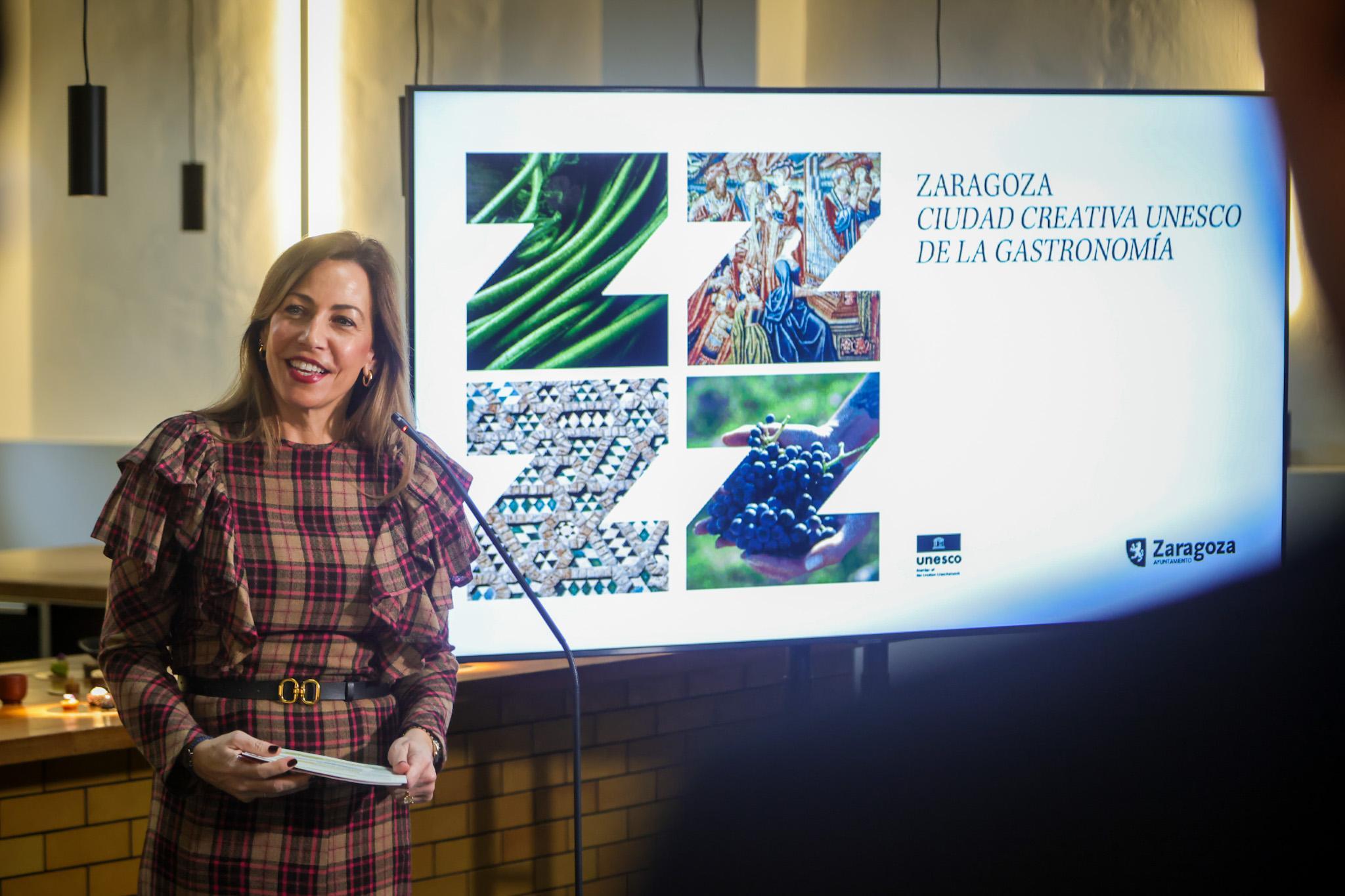 Lo ha hecho en el restaurante Gente Rara, acompañada por la consejera de Cultura, Educación y Turismo, Sara Fernández, el gerente de Zaragoza Turismo, José Francisco García, y el jefe de Programas Culturales de la Comisión Española de la UNESCO, Diego Escámez, además de representantes de Horeca, Cafés y Bares y del sector.