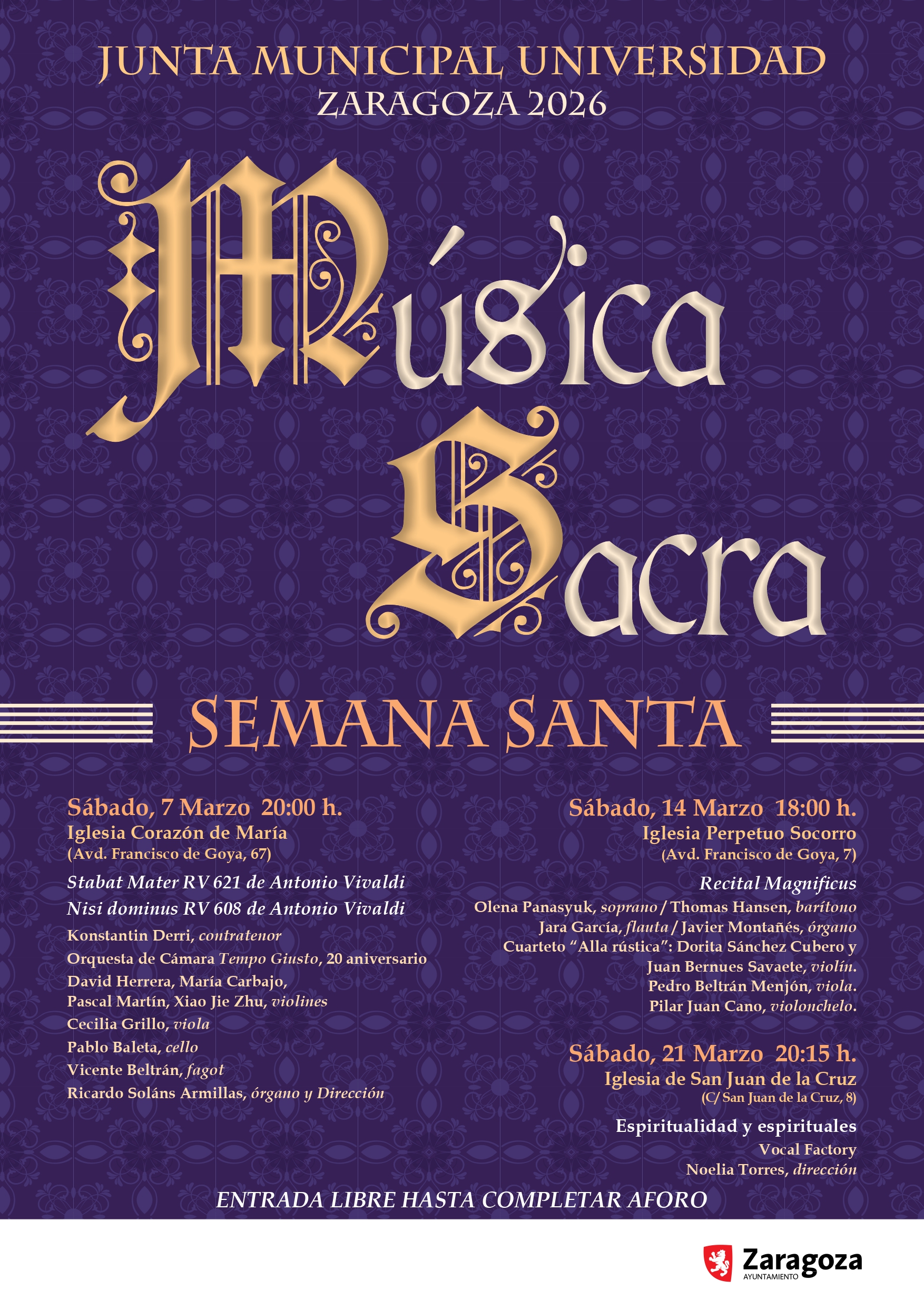 La música sacra vuelve un año más al Distrito Universidad con su ya tradicional ciclo, que sirve como preludio de la Semana Santa. El próximo concierto se celebrará este sábado, 14 de marzo, a las 18 horas en la Iglesia del Perpetuo Socorro (Avda. de Goya, 7) con la sofisticación de las obras vocales del Barroco y el equilibrio del Clasicismo. Contará con Olena Panasyuk como soprano, Thomas Hansen, barítono, Jara García, flauta, Javier Montañés, órgano y el Cuarteto Alla rústica, compuesto por Dorita Sánchez Cubero, Juan Bernues Savaete, violín, Pedro Beltrán Menjón, viola y Pilar Juan Cano, violonchelo.