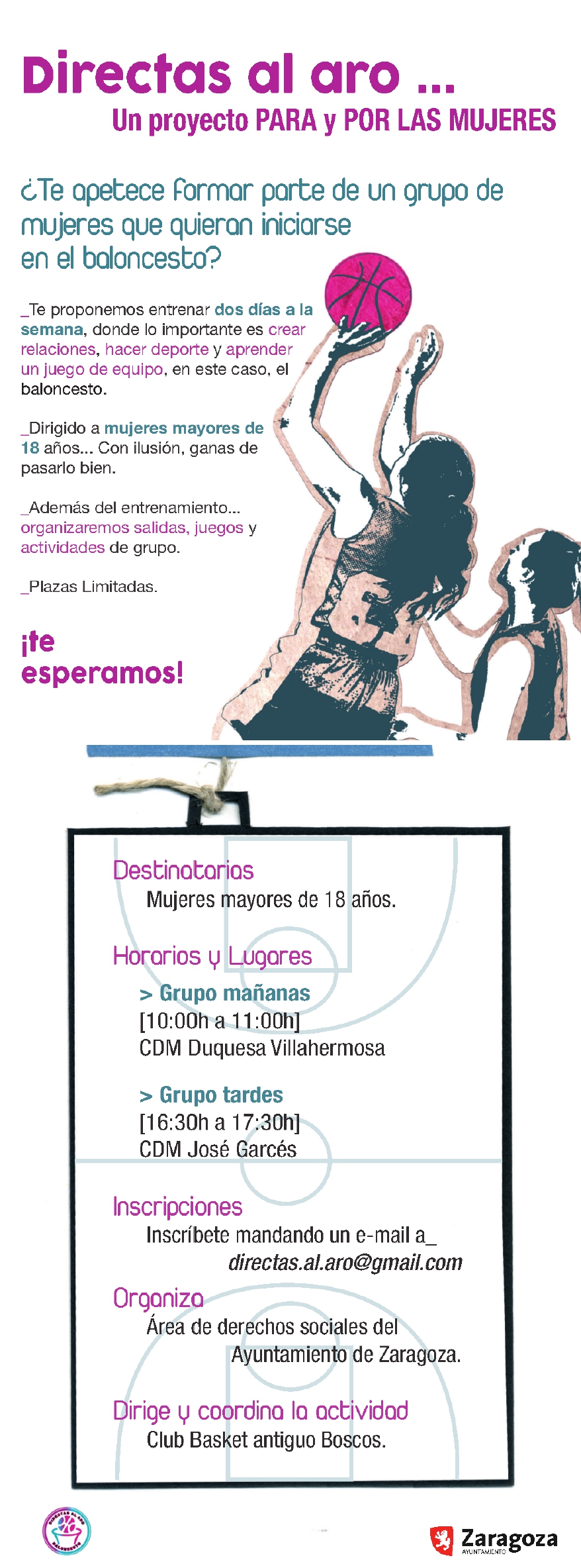 El proyecto municipal `Directas al aro' prepara su extensión al barrio de La Paz, con un nuevo grupo en el Centro Deportivo Municipal José Garcés. Se trata de una iniciativa abierta a mujeres de todas las edades mayores de 18 años que deseen iniciarse en el baloncesto como una actividad para fomentar la salud, el empoderamiento femenino y la inclusión social. No importa el nivel de juego y no es necesario tener experiencia previa.