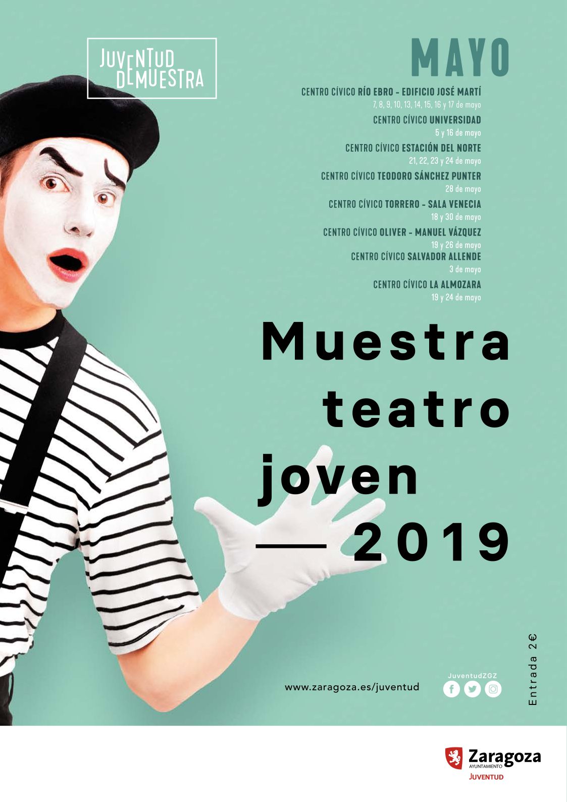 El Servicio de Juventud del Ayuntamiento de Zaragoza organiza la 32 edición de la Muestra de Teatro Joven, en colaboración con la Red de Centros Cívicos de la ciudad. Del 3 al 30 de mayo, actuarán un total de 23 grupos y 200 actores y actrices procedentes de Casas de Juventud, PIEEs y otros centros educativos de Zaragoza. Entre todos ellos ofrecen un amplio e interesante cartel con variedad de obras y géneros.