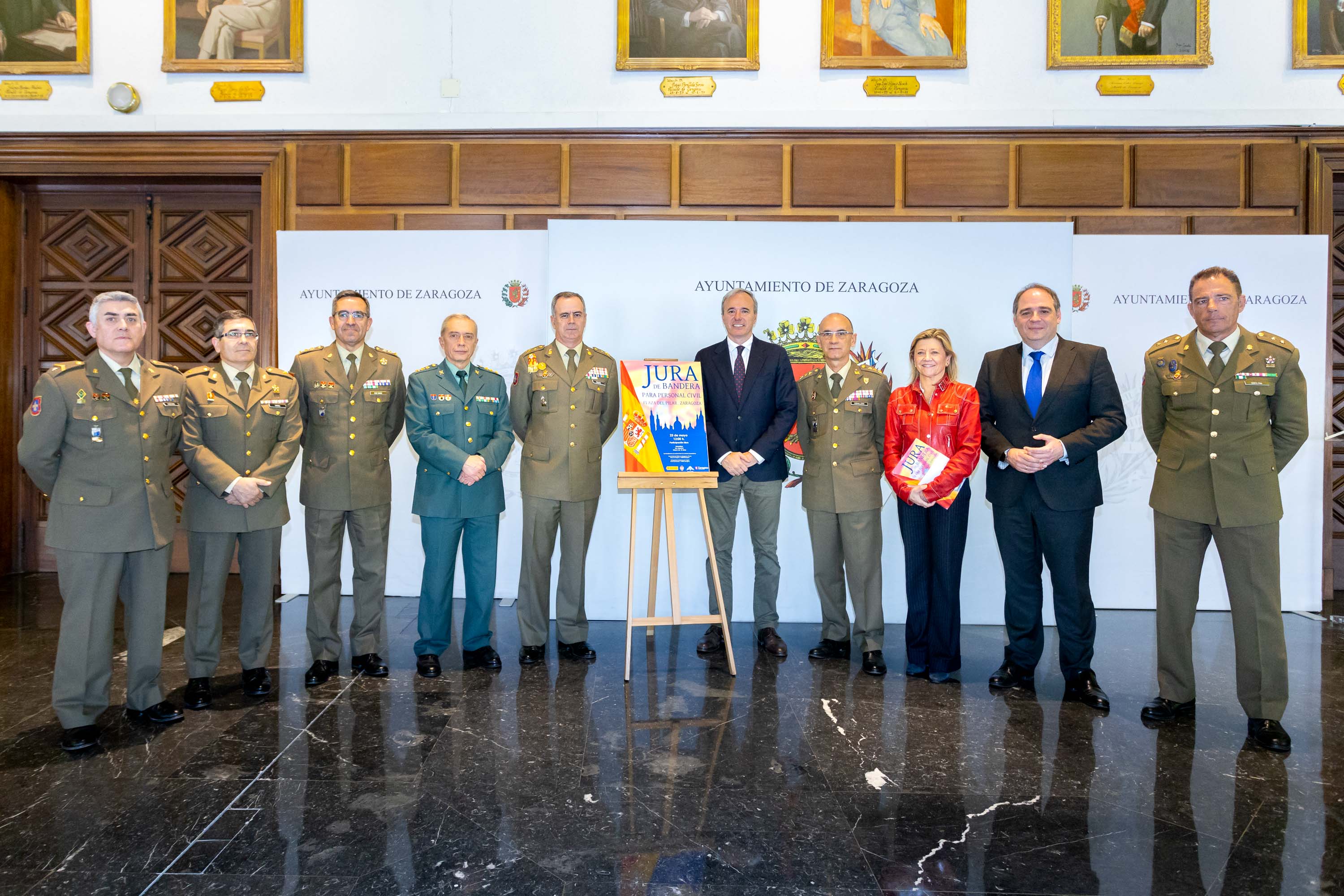 El alcalde de Zaragoza, Jorge Azcón, el delegado de Defensa en Aragón, Conrado Cebollero, y el comandante militar de Zaragoza y Teruel, el general Melero, han presentado, esta mañana, en el Ayuntamiento, la Jura de Bandera de personal civil que se celebrará el próximo 23 de mayo en la plaza del Pilar.