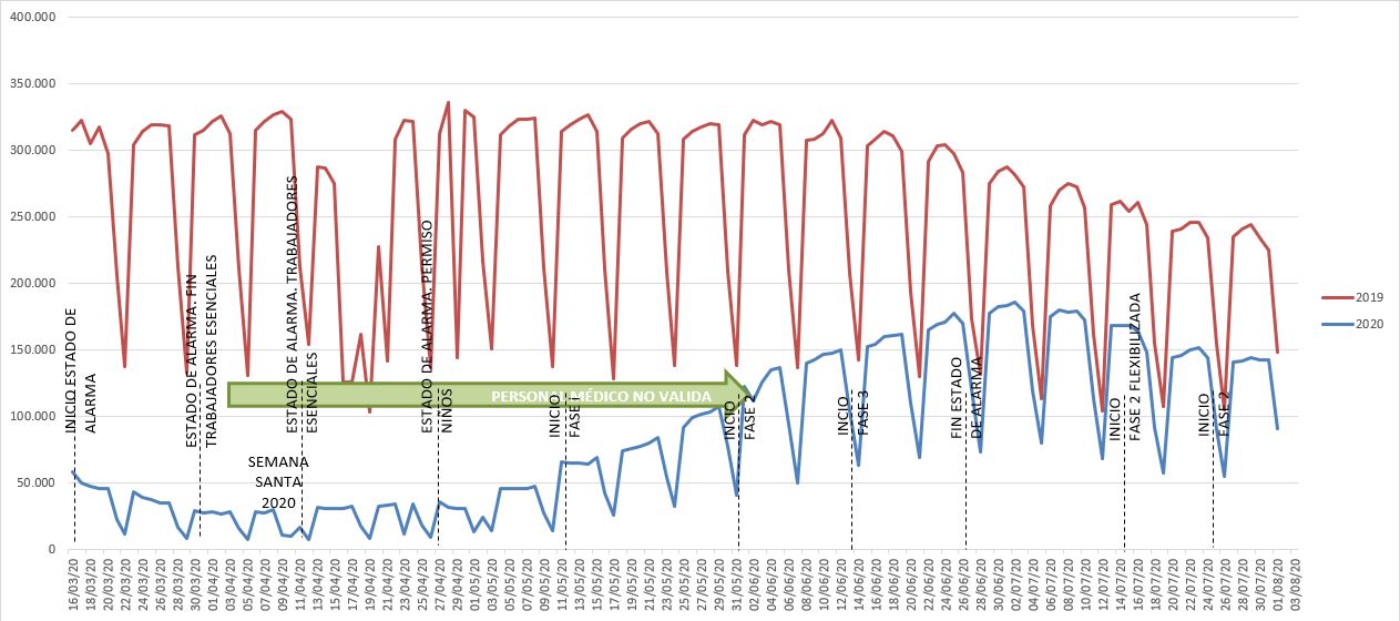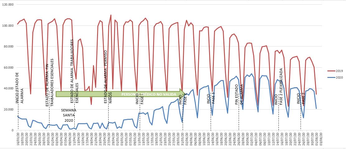 La evolución en la curva de usos es muy reveladora y está claramente acompasada con el devenir de las diferentes fases de evolución de la pandemia. El estado de alarma, que supuso el confinamiento general, llevó a cifras nunca vistas hasta ahora y realmente mínimas, sobre todo en fines de semana.