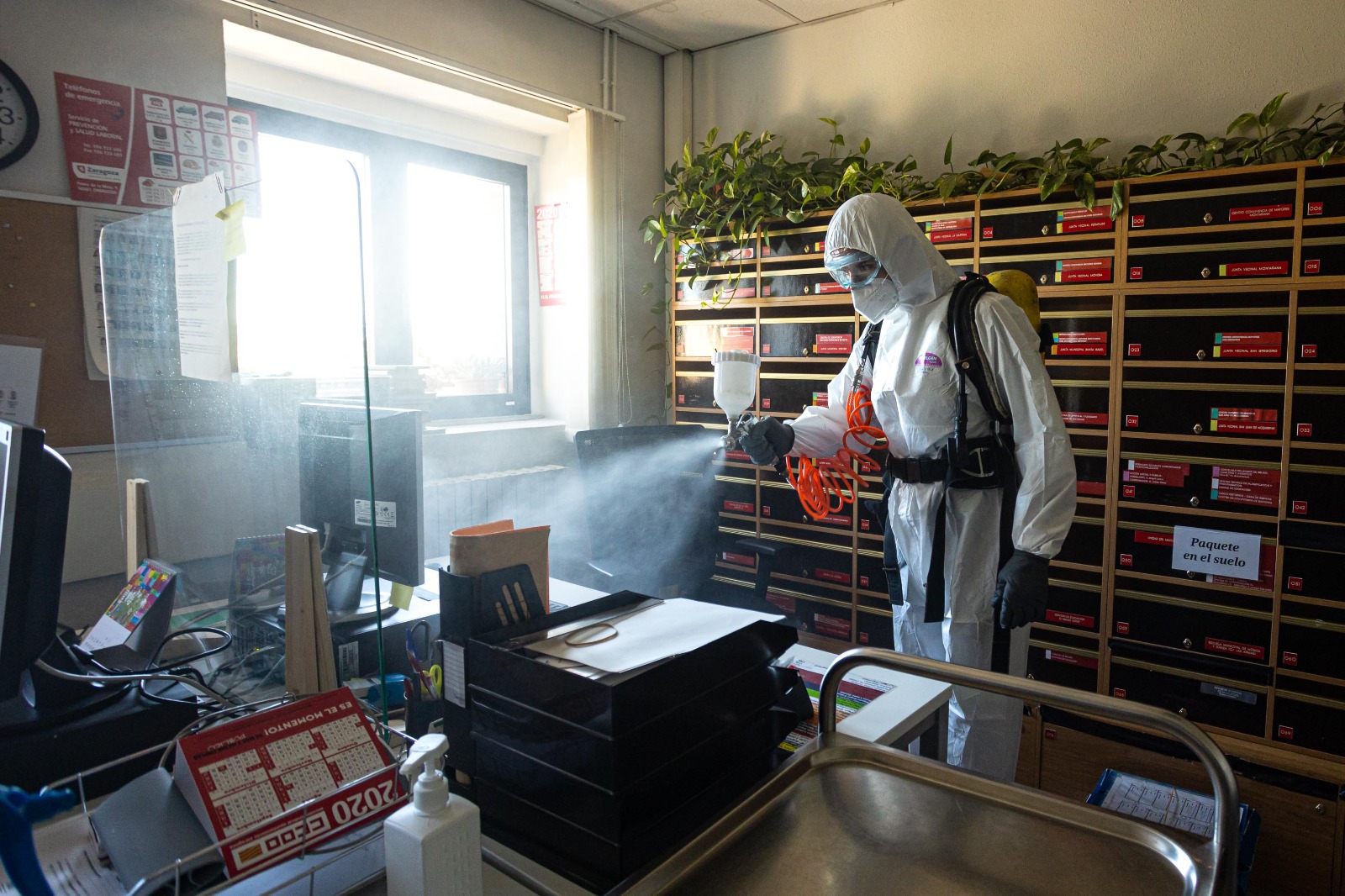 Los trabajos de limpieza, en los que han participado cinco agentes de Bomberos, dos de los cuales han portado trajes de protección nivel II, han consistido en la aplicación en forma nebulizada de una mezcla de agua y lejía doméstica sobre la superficie. A continuación, una vez concluida esta primera fase, se instalarán cañones de ozono para higienizar todavía más las instalaciones, ha explicado el subjefe de Intervención, Fran Tomey.