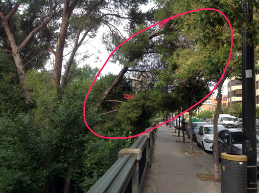 En esa zona hay también varias enredaderas, entre las que se ha identificado la viña del Tíbet (Fallopia baldschuanica) así como varios ejemplares de ailantos (pequeños y grandes, normalmente en grupo). Todas ellas están ampliando sus poblaciones y en ocasiones crecen lo suficiente como para ocupar parte de las aceras. Los trabajos consistirán en la corta y erradicación de los ejemplares y grupos de ejemplares que ocupen las aceras.
