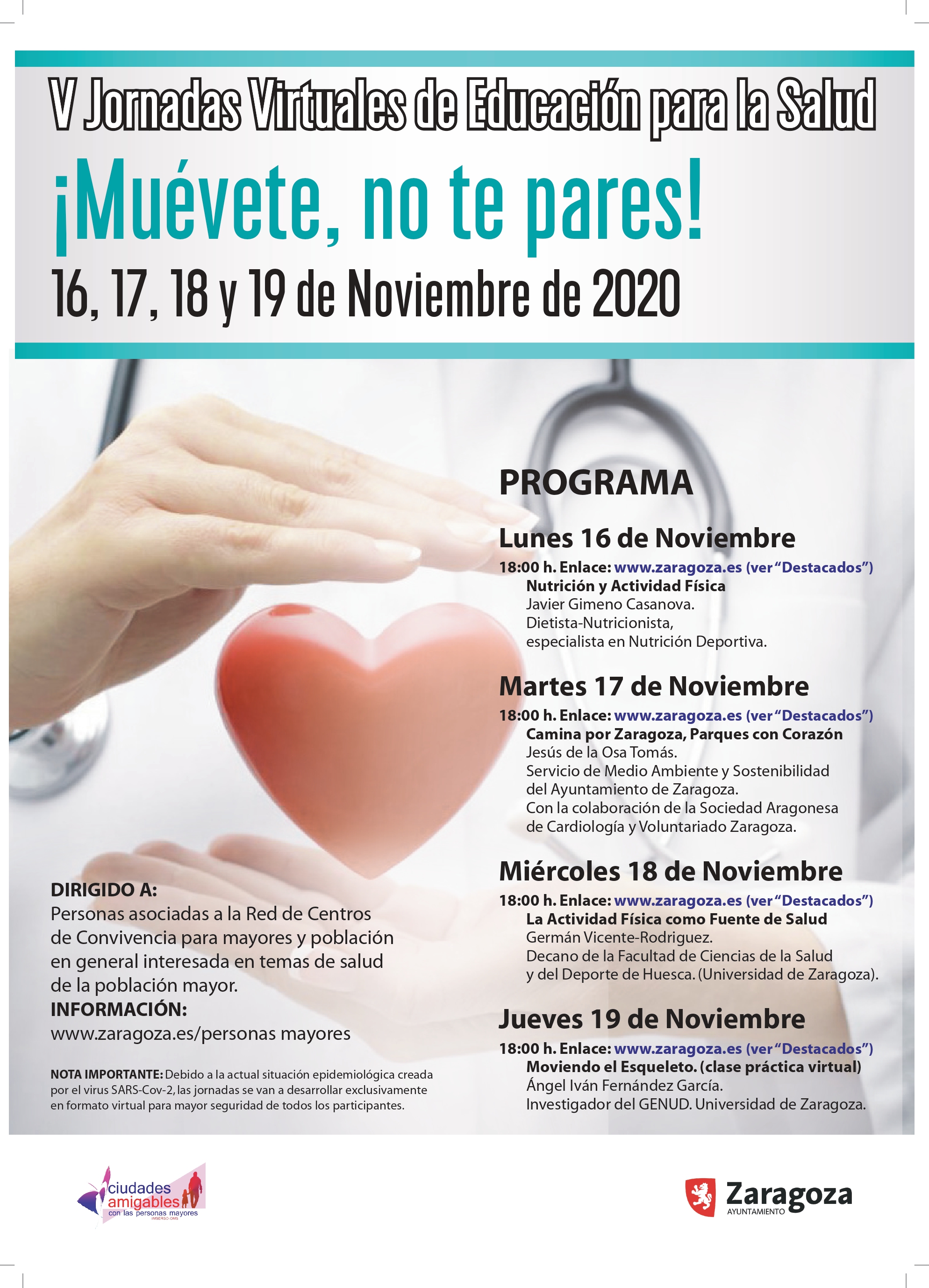 La Concejalía de Mayores del Ayuntamiento de Zaragoza -adscrita al Área de Acción Social y Familia- celebra del 16 al 19 de noviembre las V Jornadas de Educación para la Salud `Muévete, no te pares', este año en formato online a través de la web municipal www.zaragoza.es.