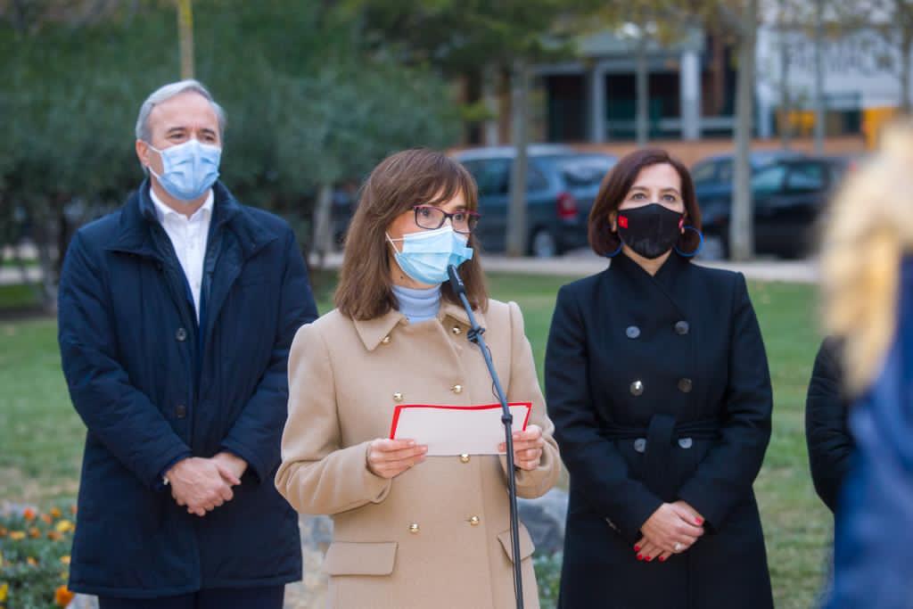 En este jardín, ubicado en el parque de La Azucarera, el Ayuntamiento de Zaragoza ha celebrado un acto en recuerdo de las víctimas de violencia de género, al que ha asistido el alcalde Jorge Azcón, la vicealcaldesa Sara Fernández, la concejala de Mujer e Igualdad, María Antoñanzas y representantes de los grupos municipales PP, PSOE, Cs, Podemos y Zec.