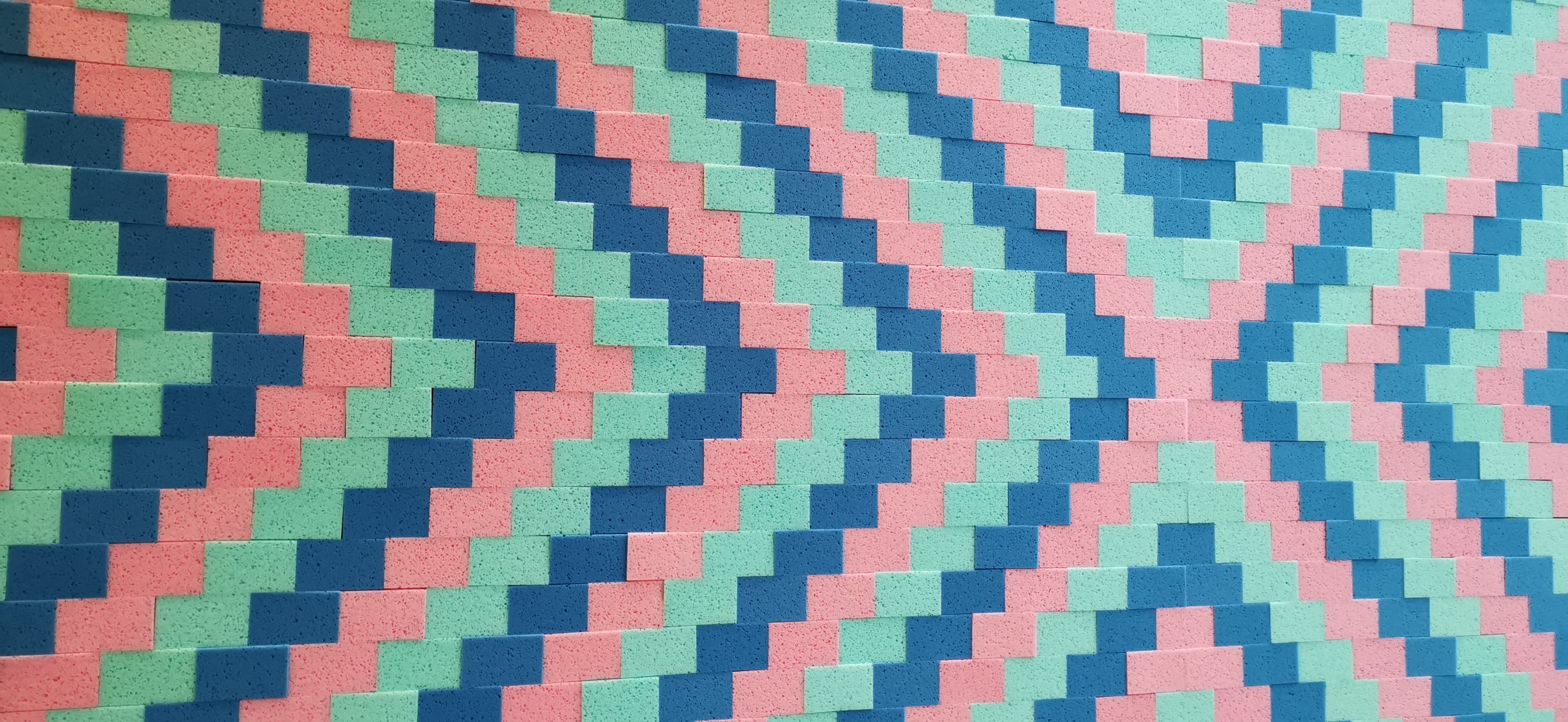 Víctor Solanas-Díaz nos presenta una nueva intervención realizada, en esta ocasión, con elementos industriales, que invitan al espectador a reflexionar sobre el espacio y su ocupación, y sobre la escala temporal y espacial que la época impone. Las estructuras creadas con sencillas esponjas de baño sintéticas -cada vez más en desuso- están pensadas para generar una serie de redes modulares que recuerdan a diversos elementos propios de edificios civiles y religiosos de épocas pasadas, donde paredes, suelos y techos tenían una decoración geométrica perfectamente estructurada, que en este caso se ha realizado siguiendo los criterios de percepción del color RGB (Red-Green-Blue).