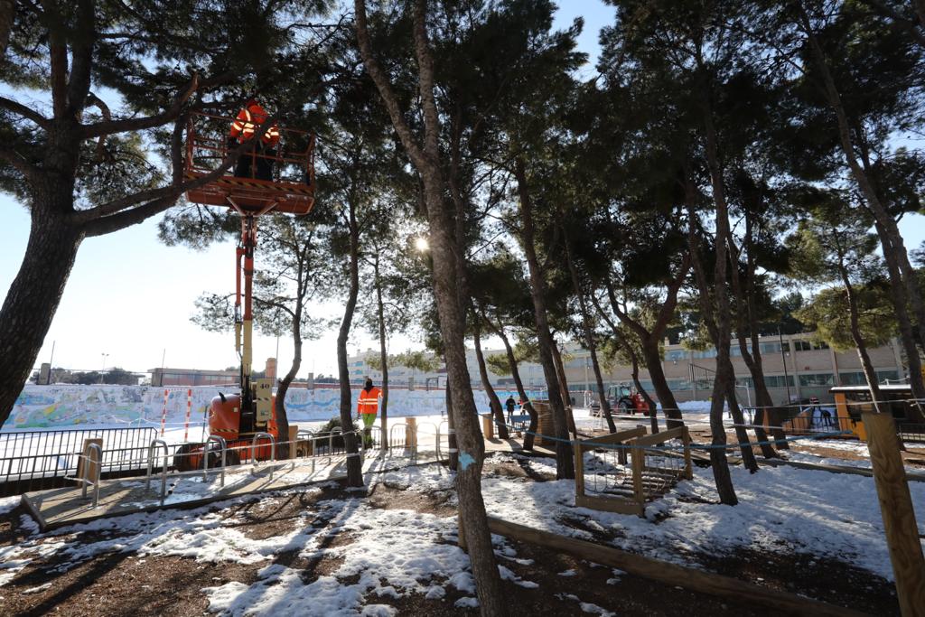 El dispositivo de limpieza comenzaba las primeras labores ayer y desde esta mañana se han intensificado en los centros con mayores problemas. A estas horas, además de los casi 50 operarios, trabajan en las labores de retirada de hielo y nieve, 13 máquinas bobcat y un pluma. "Los árboles de algunos centros se han visto afectados por la nieve. Por seguridad estamos retirando las ramas más peligrosas para evitar cualquier problema", ha concretado Serrano.