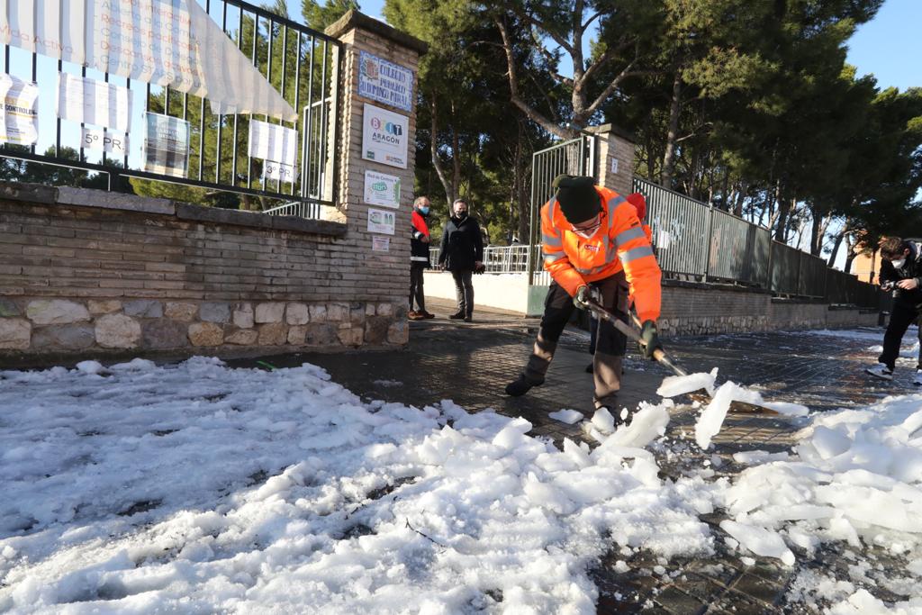 El Ayuntamiento de Zaragoza a través de las brigadas de arquitectura dependientes de la Consejería de Urbanismo y Equipamientos está limpiando desde ayer lunes los colegios públicos de la ciudad, para garantizar la accesibilidad a partir de mañana, cuando se produzca la vuelta a las aulas tras el paso de la borrasca Filomena. En estos momentos, una veintena de operarios de las brigadas y otros 22 trabajadores de empresas contratadas se afanan en retirar toda la nieve acumulada en los viales de acceso a los centros educativos y también en los patios interiores. "Como Ayuntamiento, nosotros lo que buscamos es que el acceso a los colegios públicos de la ciudad se produzca mañana con la mayor normalidad posible, garantizando por un lado, la accesibilidad tanto de alumnos como de profesores, y por otro que las condiciones de confort térmico sean las mejores, tras los días de nieve que hemos tenido", ha explicado el consejero de Urbanismo y Equipamientos, Víctor Serrano, en su visita al colegio público Domingo Miral, uno de los más afectados por el hielo y la nieve.
