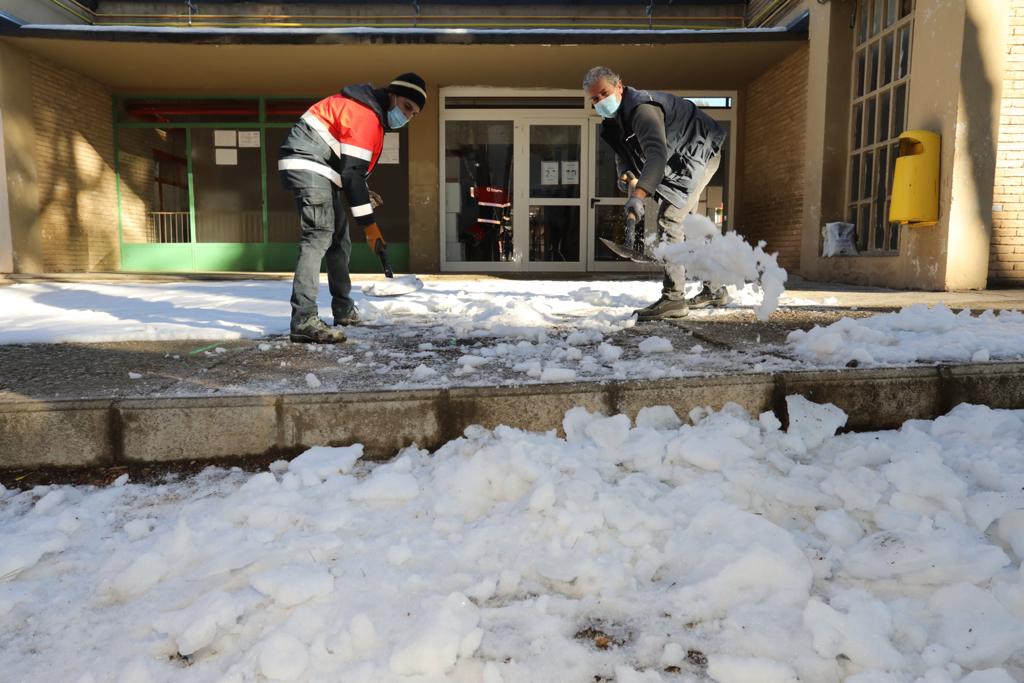 Una veintena de operarios de la brigadas de arquitectura de la Consejería de Urbanismo y 22 trabajadores contratados trabajan desde ayer en la retirada de nieve de las entradas a los centros educativos y los patios