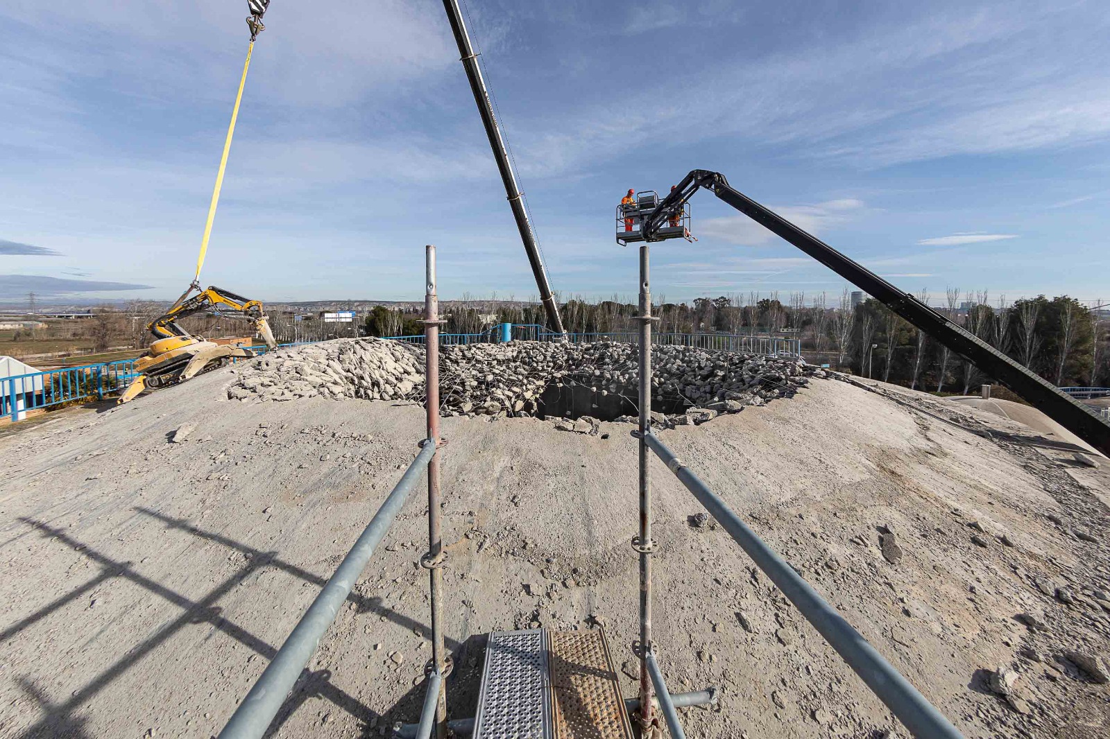 Las obras van a suponer una inversión de 1,4 millones € y se prolongarán durante cinco meses. Ecociudad Zaragoza está demoliendo la cúpula de hormigón armado y acero utilizando un robot teledirigido