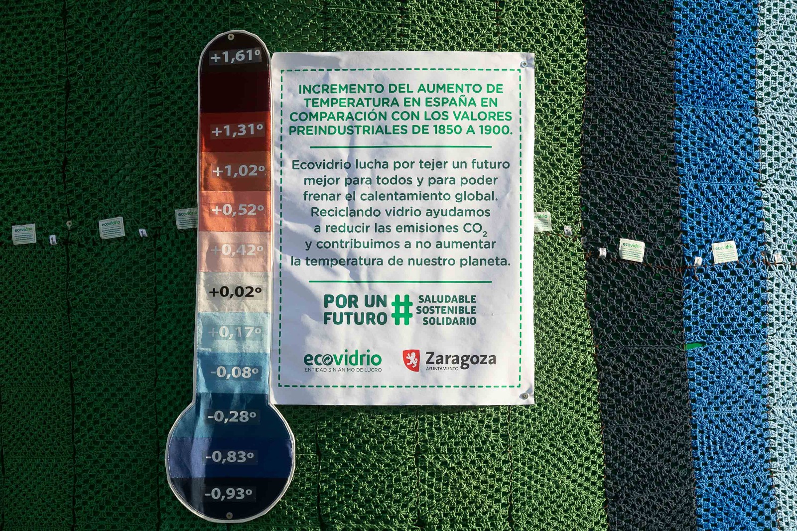 Con motivo del Día Mundial de la Acción frente al Calentamiento Terrestre, que se celebra hoy jueves, Ecovidrio -entidad sin ánimo de lucro encargada de la gestión del reciclado de los residuos de envases de vidrio en España- y el Ayuntamiento de Zaragoza han instalado en la Plaza del Pilar el contenedor más grande del mundo, recubierto con bufandas artesanales que muestran la evolución de las temperaturas en España en los últimos 100 años.