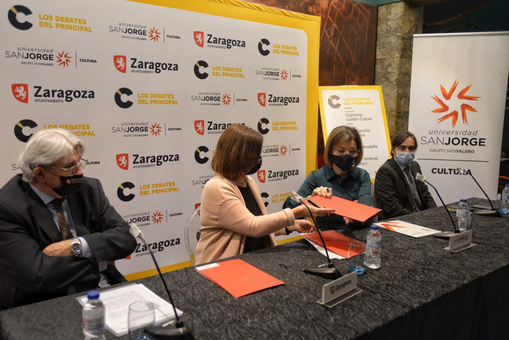 El Teatro Principal y la Universidad San Jorge han firmado un convenio de colaboración para llevar a cabo un ciclo de divulgación cultural, centrado en esta ocasión en materia de artes escénicas. Bajo el título de "Los debates del Principal", ambas instituciones han organizado una serie de sesiones culturales que han sido presentadas esta mañana por la vicealcaldesa y consejera de Cultura y Proyección Exterior, Sara Fernández, y la rectora de la Universidad San Jorge, Berta Sáez, acompañadas por José María Turmo, gerente del Patronato Municipal de las Artes Escénicas y de la Imagen, y Nacho Escuín, responsable de Cultura de la Universidad.