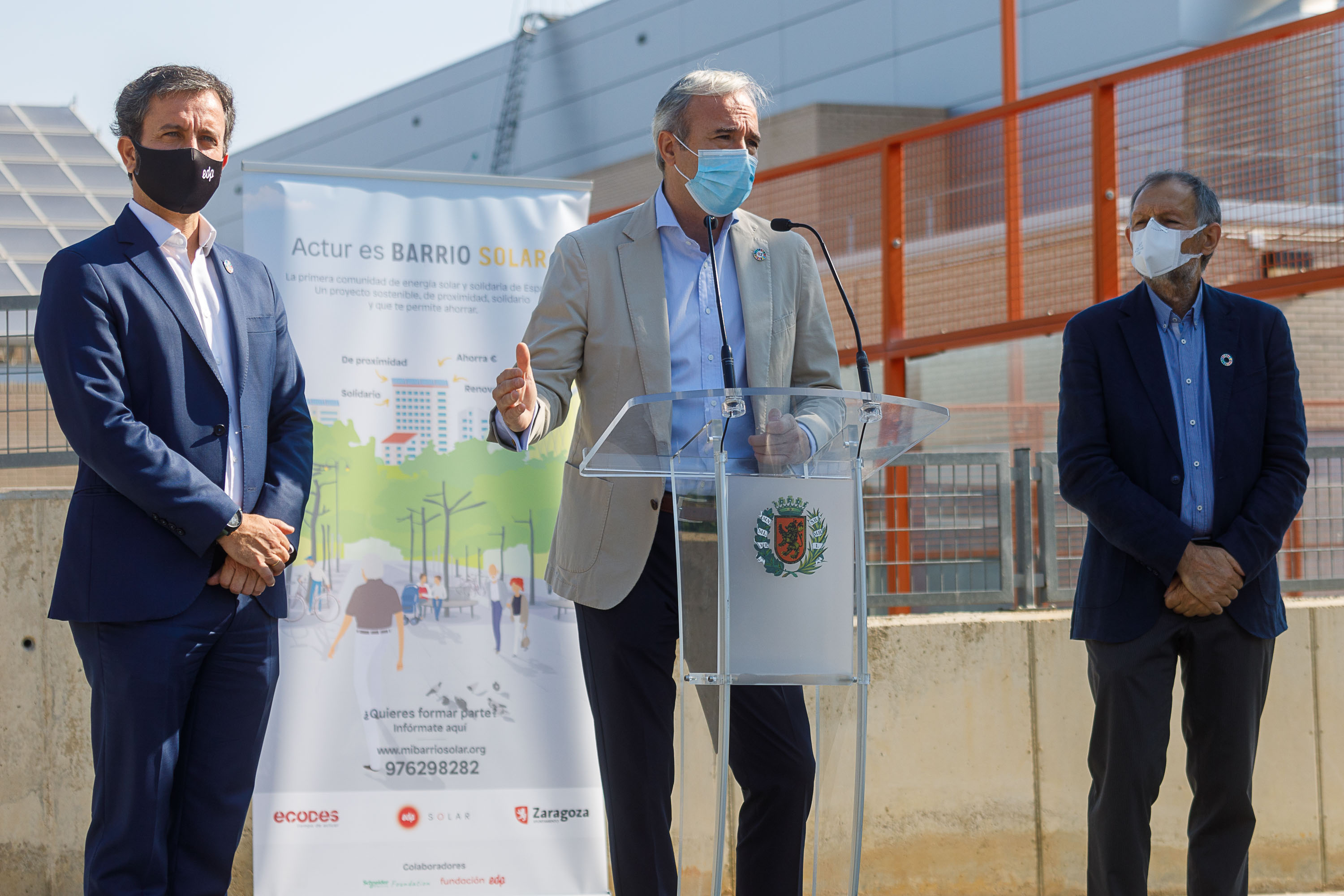 Actur Barrio Solar, la iniciativa impulsada por el Ayuntamiento de Zaragoza, ECODES y EDP, coge forma tras el inicio de los trabajos de instalación de los primeros paneles solares en los centros deportivos municipales Actur V y Siglo XXI. Con esta pionera iniciativa, dirigida a fomentar el autoconsumo colectivo, 200 vecinos y comercios de Zaragoza podrán beneficiarse de energía solar generada en las cubiertas de edificios municipales. El primer barrio solar de España, solidario y renovable, estará operativo el próximo otoño en el barrio Actur-Rey Fernando. Todos los avances del proyecto se han dado a conocer en un acto al que han asistido Jorge Azcón, alcalde de Zaragoza, Víctor Viñuales, director ejecutivo de ECODES, y Gabriel Nebreda, director de EDP Solar.