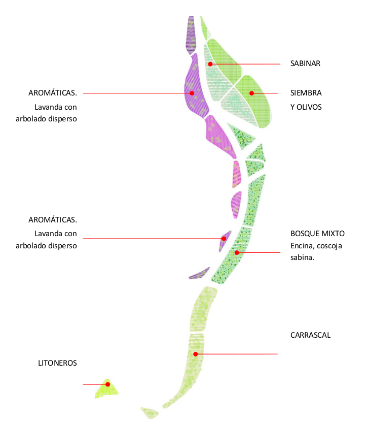 En esta superficie, de alrededor de 40.000 metros cuadrados (4 hectáreas) crecerán a lo largo de los próximos años sabinas, carrascas, pinos y almeces, así como así como jaras o esparto. En las siguientes fases de intervención previstas para más adelante se incorporarán otras especies, como olivos, cipreses, granados, almendros o árboles del amor, así como distintas especies de arbustos como lentiscos, espinos negros, sabinas, labiérnagos, mirtos y coscoja, entre otras especies de arbustos.