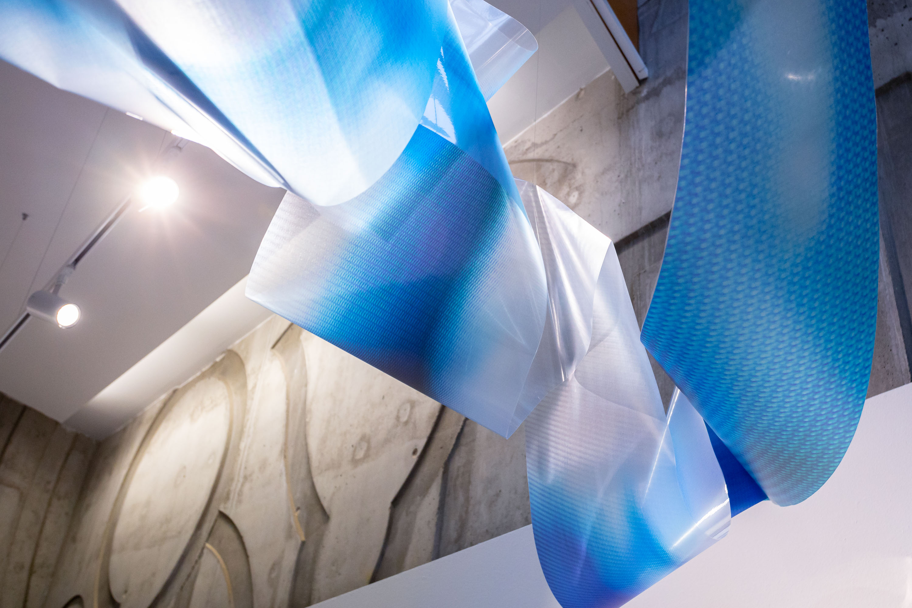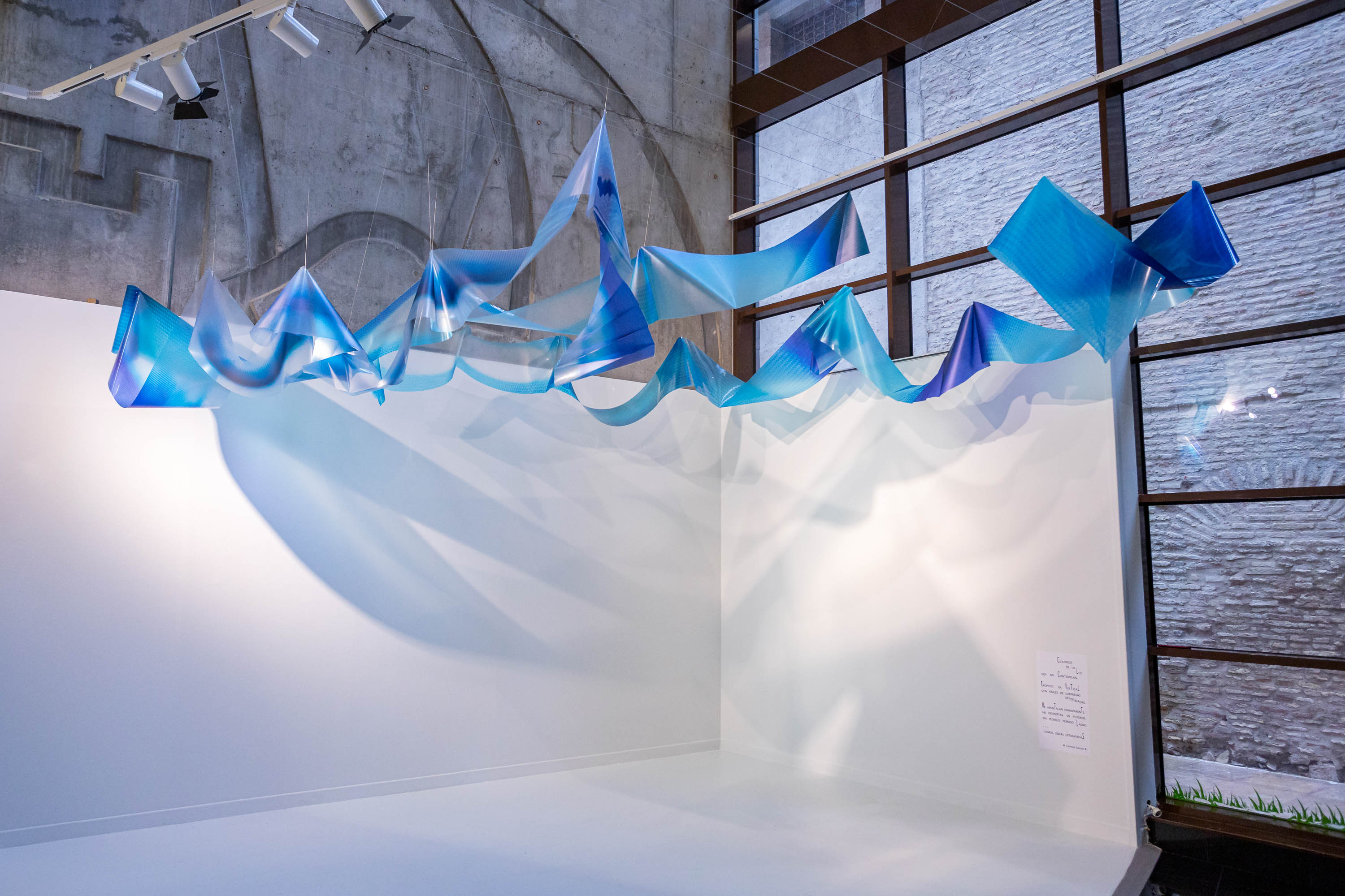 Esta artista multidisciplinar se dedica a investigar las características y la esencia de la luz y el color para plasmarlo en una personal obra artística. Partiendo de la fotografía, la artista explora nuevos caminos plásticos, gráficos y escultóricos a través de la luz y el color como temas principales de su trabajo. En esta instalación, la obra busca dialogar con el gran ventanal de luz natural del Espacio Tránsito, cambiante con el paso de las horas y el vacío.