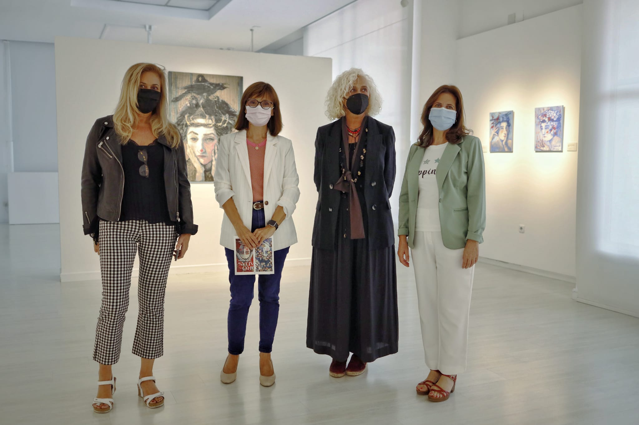 Más de veinte obras componen esta muestra en la que aparecen cabezas femeninas coronadas por cuervos, libros, pinceles y hasta calaveras