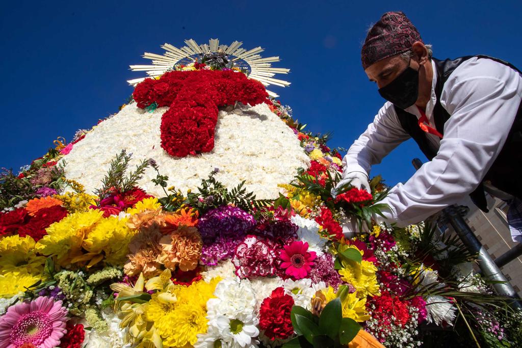 La jornada ha transcurrido con normalidad, sin retrasos y el manto de la Virgen ha sido este año multicolor, destacando la Cruz de Lorena de claveles rojos sobre un óvalo de flores blancas