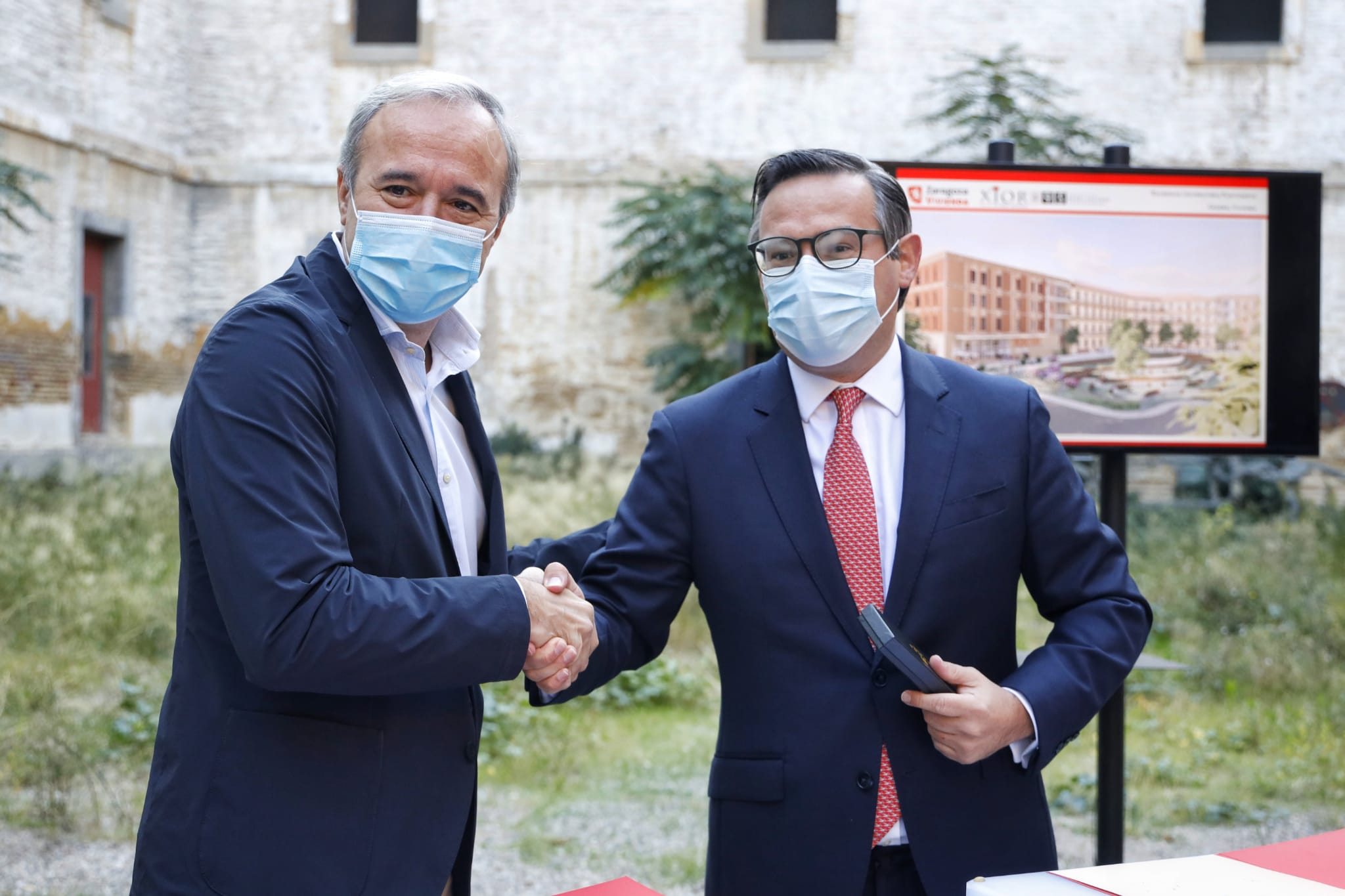 El alcalde de Zaragoza, Jorge Azcón, y el Director de Inversiones y director general de la Península Ibérica de Xior Student Housing, Bastiaan Grijpink, han suscrito esta mañana el contrato por el que la empresa convertirá el antiguo Cuartel de Sangenis en una residencia universitaria.