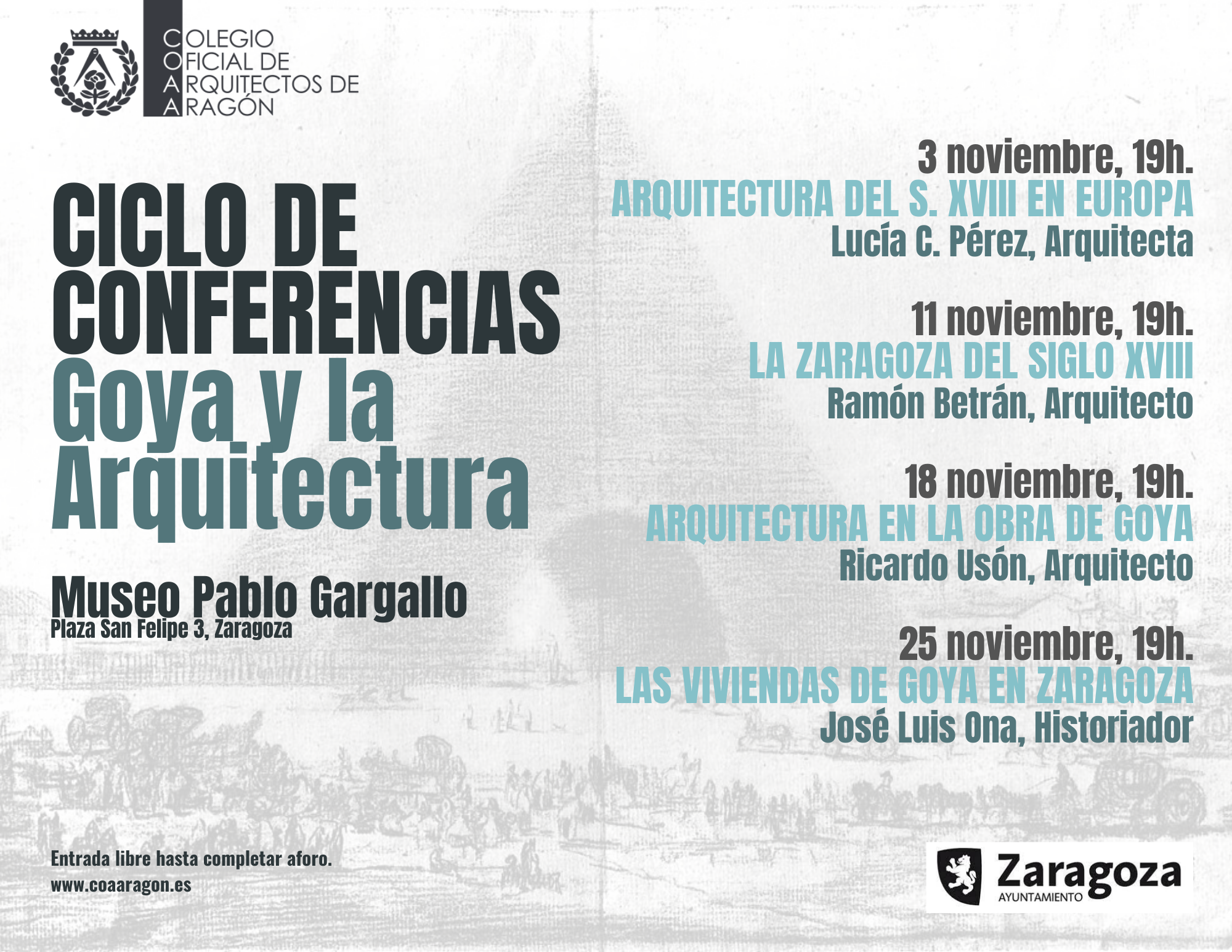 El Ayuntamiento de Zaragoza colabora con el Colegio Oficial de Arquitectos de Aragón en la organización de un ciclo de conferencias sobre “Goya y la arquitectura”, que se pone en marcha a partir de hoy miércoles, 3 de noviembre, y que se desarrollará a lo largo de todo el mes.