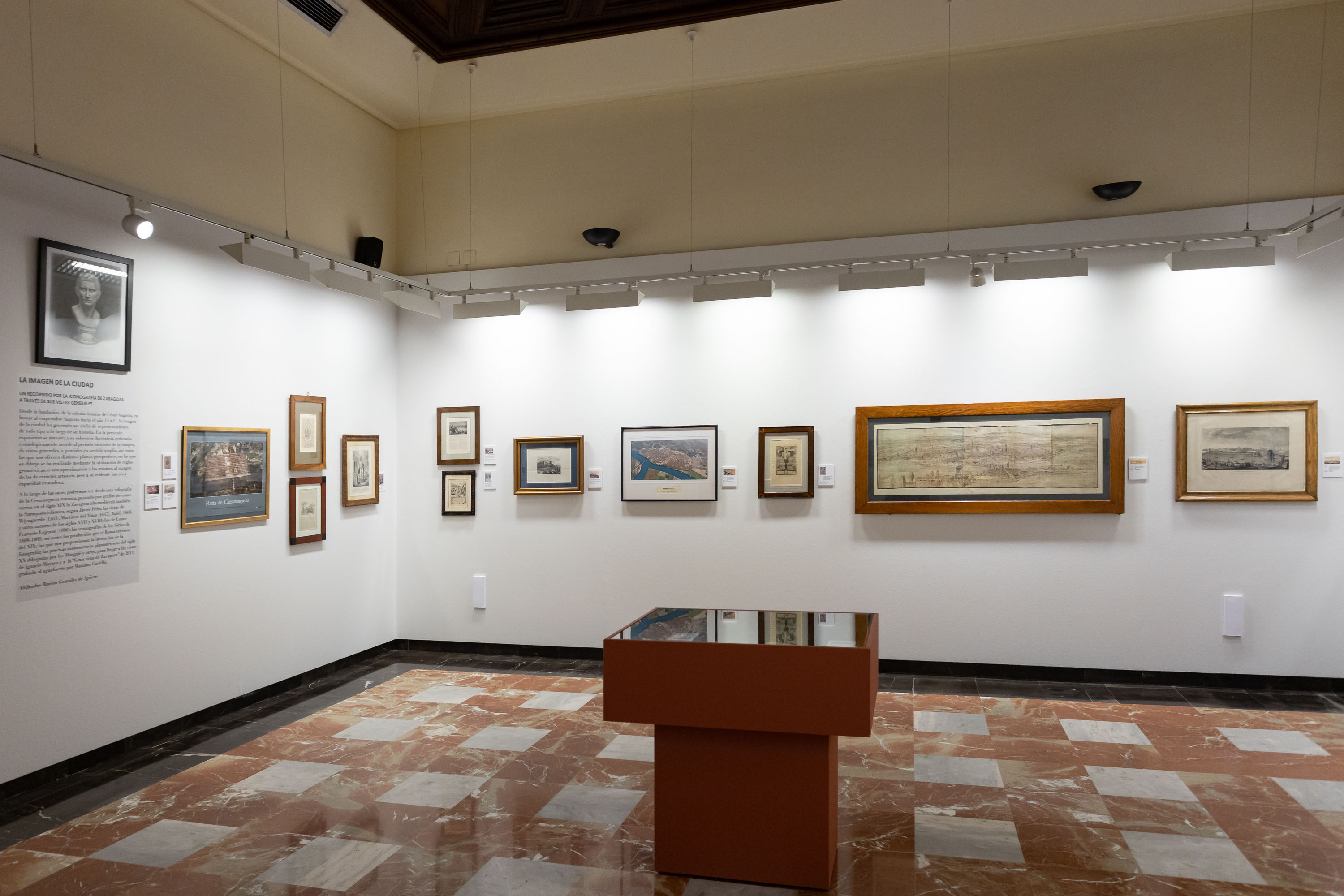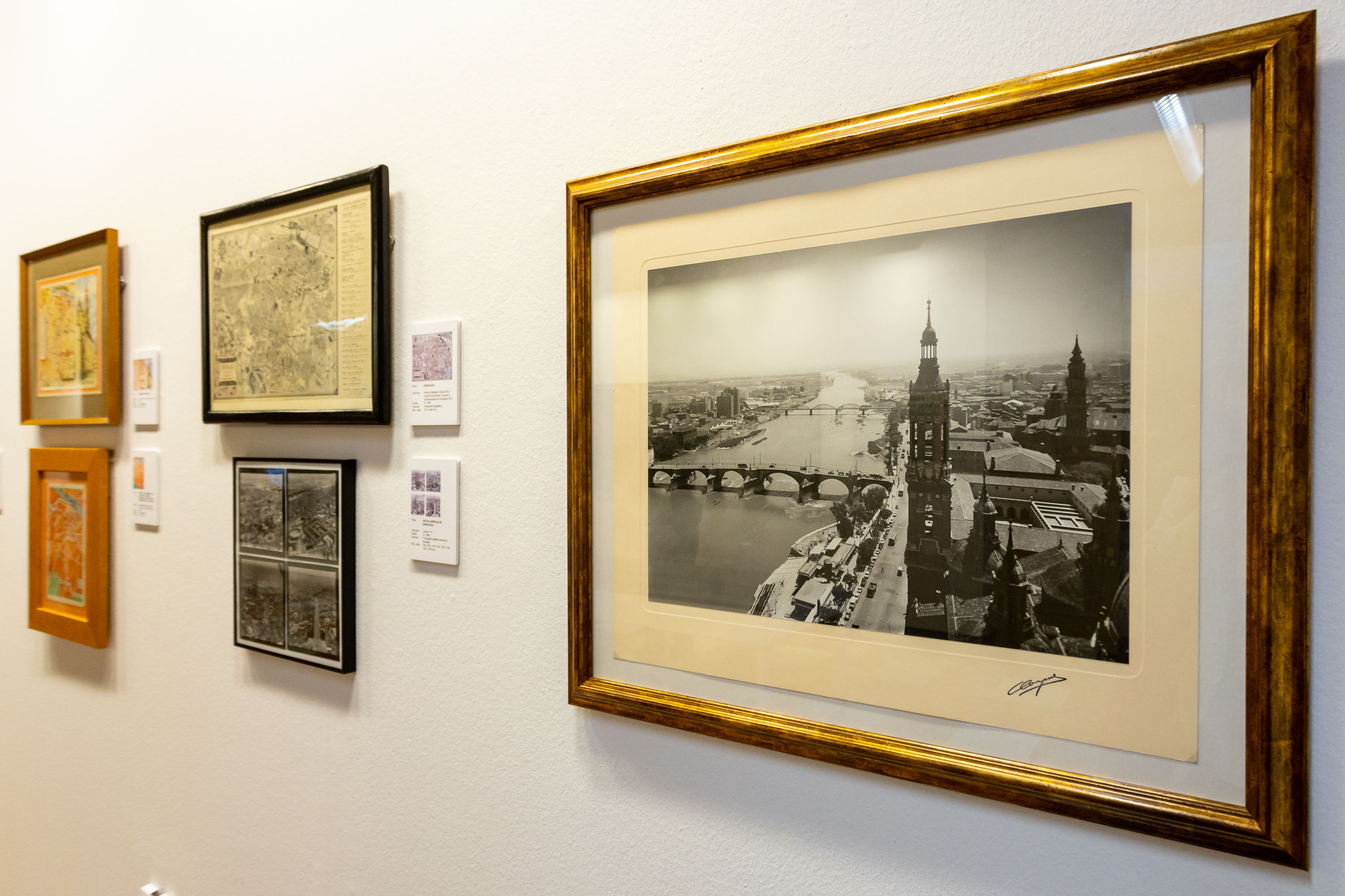 Se podrán contemplar, entre otras muchas, obras como la reproducción a vista de pájaro de la ciudad de Zaragoza de Anton van den Wyngaerde (1563), la dibujada por Juan Bautista del Mazo (1647), el plano-alzado de Carlos Casanova (1734), la serie de las ruinas de Zaragoza de Juan Gálvez y Fernando Brambila (1812-1813), las fotografías de Laurent y Cia (1874-1877), las planimetrías más destacadas del siglo XX y algunas piezas tan sugerentes como la perspectiva curvilínea esférica –también llamada de “ojo de pez”– realizada por el francés Philippe Laffont (2011), cuyo punto de vista se ha situado en la torre denominada Alta del Río de la basílica de Nuestra Señora del Pilar.