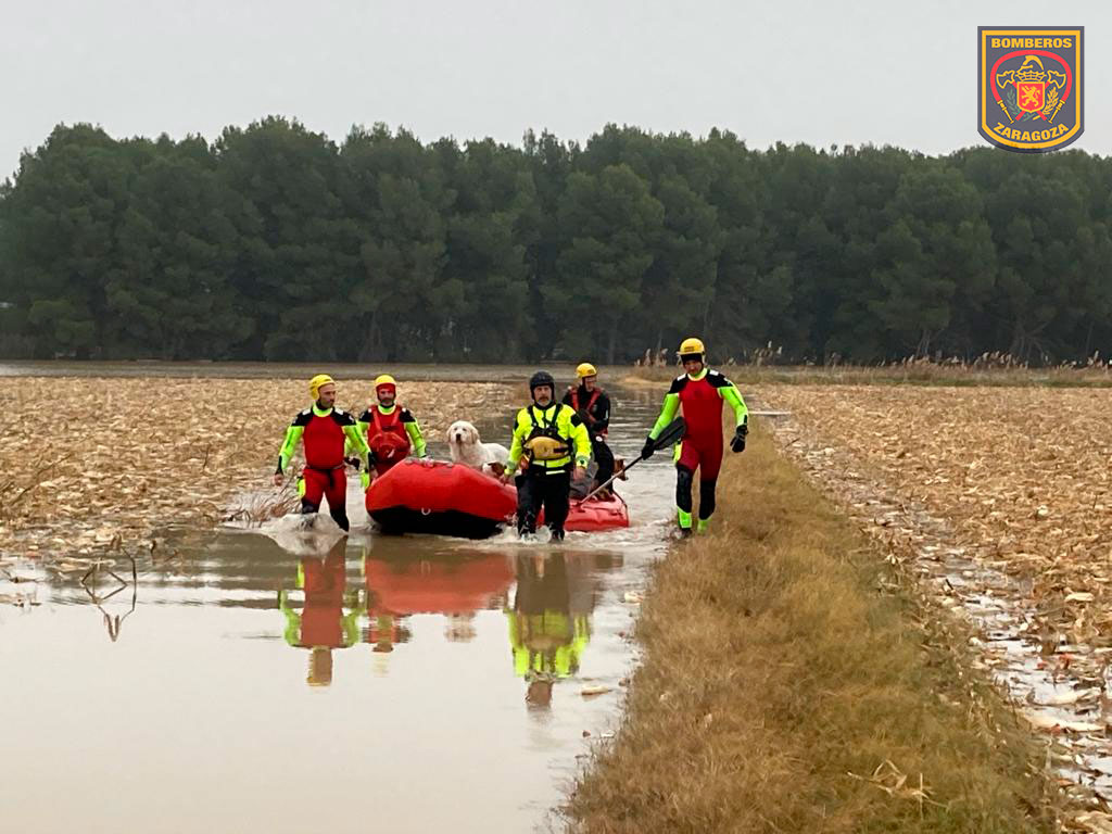 Además, los Bomberos de Zaragoza han actuado también en granjas de animales y en centros caninos, ubicadas en zonas inundadas. En concreto, se ha desalojado la Granja de Vacas Lecheras con 300 cabezas de ganado, situada en la margen izquierda en la desembocadura con el río Gállego, y 250 perros de residencias caninas en la zona de Juslibol.