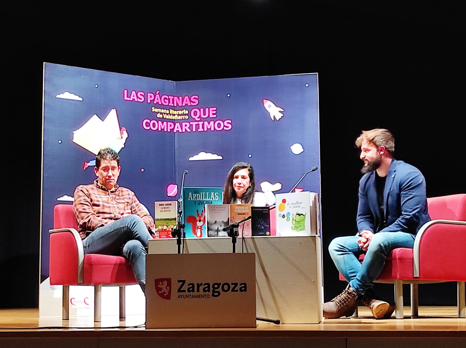 Eduardo Aísa, de Librería Babel, el Sergio Royo y la responsable de la biblioteca del CEIP Jerónimo Blancas, Fina Remón, protagonizan esta tarde una charla en la que contarán cómo es ‘Vivir entre libros’