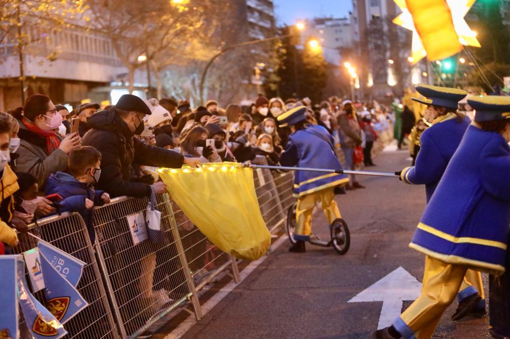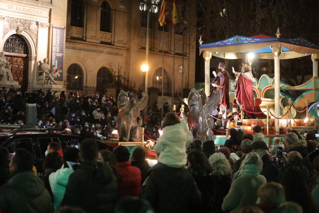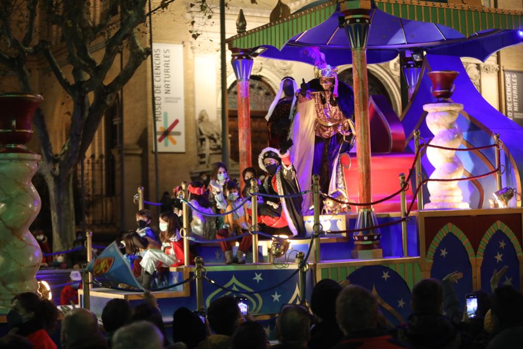 Los niños y niñas de Zaragoza han podido este año recibir a Sus Majestades de Oriente, con la celebración de la Cabalgata, que ha recorrido esta tarde distintas calles de la ciudad. La ilusión y la alegría de los más pequeños con la presencia de los Reyes Magos han protagonizado la cabalgata de este 2022, que ha tenido que reducir el número de participantes en la comitiva para cumplir con la normativa vigente del Gobierno de Aragón y garantizar las medidas sanitarias frente a la Covid-19. Además, se han aumentado las distancias entre los miembros de las compañías que han desfilado y los Reyes Magos y pajes portaban sus mascarillas.