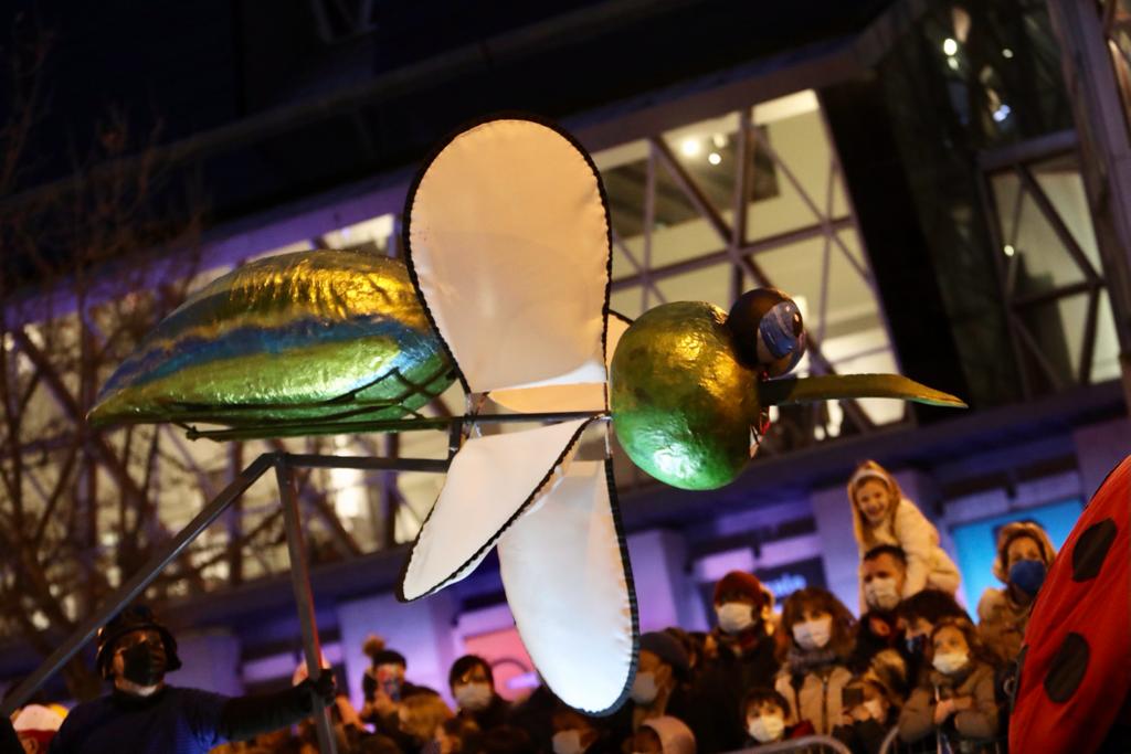 Una gigante estrella hinchable ha abierto la cabalgata en su recorrido, seguida por los carteros reales que se han ocupado de la recogida de las últimas cartas a Sus Majestades de Oriente. En el desfile se ha contado también con la animación del Señor Tornavís de Xar, la presencia de personajes fantásticos infantiles, las Ocas y una marioneta gigante. Además, figuras que se transformaban en imponentes caballos de marfil han despertado emoción y sorpresa entre el público con la ayuda de movimientos y bailes. Les seguía la marioneta gigante Gaia, acompañada por seres de la Naturaleza que celebran la vida y la generosidad fecunda con ritmos alegres. No han faltado algunos bichos, como una rana gigante, las abejas zanquistas, las mariquitas o los saltamontes dando grandes saltos.