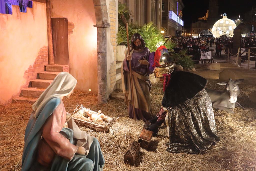 A su llegada a la Plaza del Pilar, Sus Majestades han sido recibidos por la Corporación municipal, encabezada por la vicealcaldesa y la alcaldesa infantil, y se han dirigido al Belén para realizar la tradicional adoración