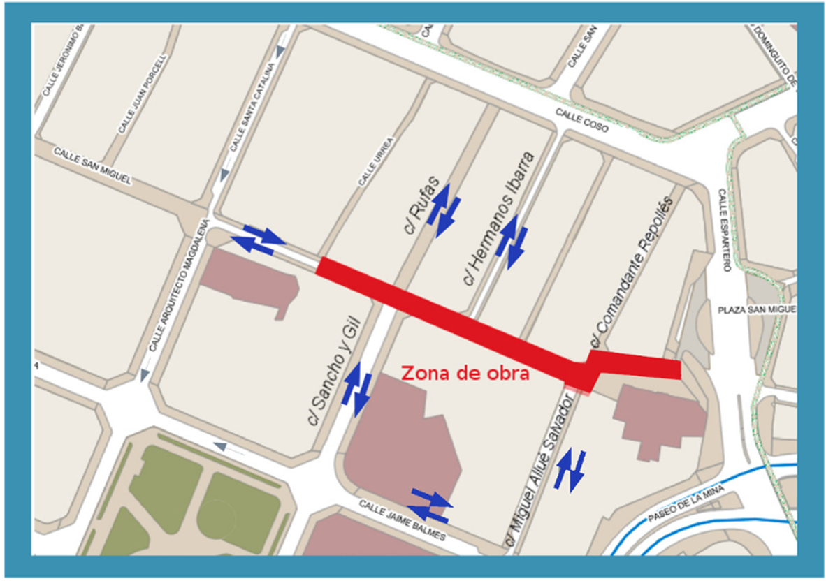 En la primera fase se va a reformar el tramo comprendido entre las calles Comandante Repollés y Urrea. De esta forma, a partir del martes día 8, se cortará al tráfico la calle San Miguel desde Plaza San Miguel hasta calle Urrea excepto para garajes autorizados. De forma provisional, para el acceso exclusivamente a los garajes, se habilitarán de doble sentido las calles Rufas, Hermanos Ibarra y Balmes, así como el tramo de San Miguel entre c/ Urrea y c/ Santa Catalina. La calle Miguel Allué Salvador también quedará en fondo de saco de forma provisional durante unas semanas mientras se realiza la conexión de la nueva red de saneamiento.