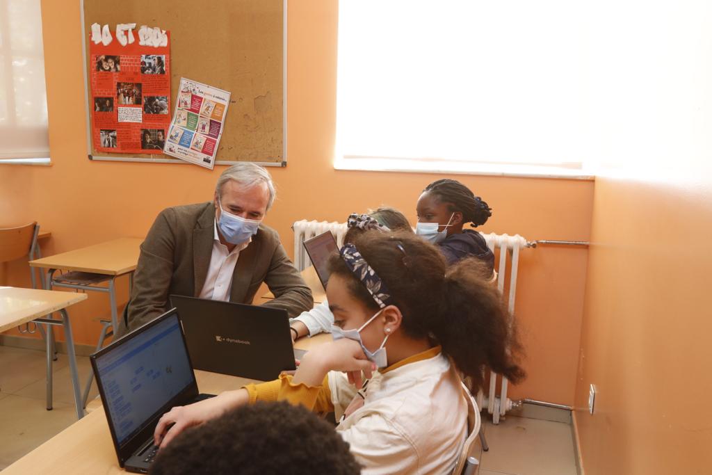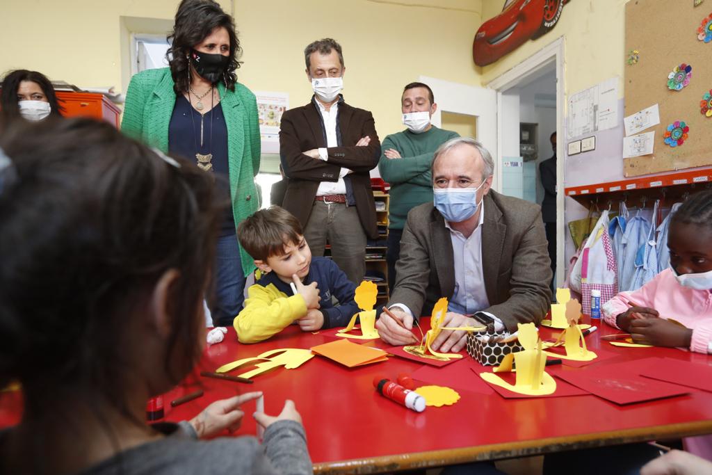 El alcalde Jorge Azcón ha visitado el colegio Cantín y Gamboa, donde 172 niños y niñas han recibido estas ayudas municipales para participar en actividades extraescolares o adquirir material formativo