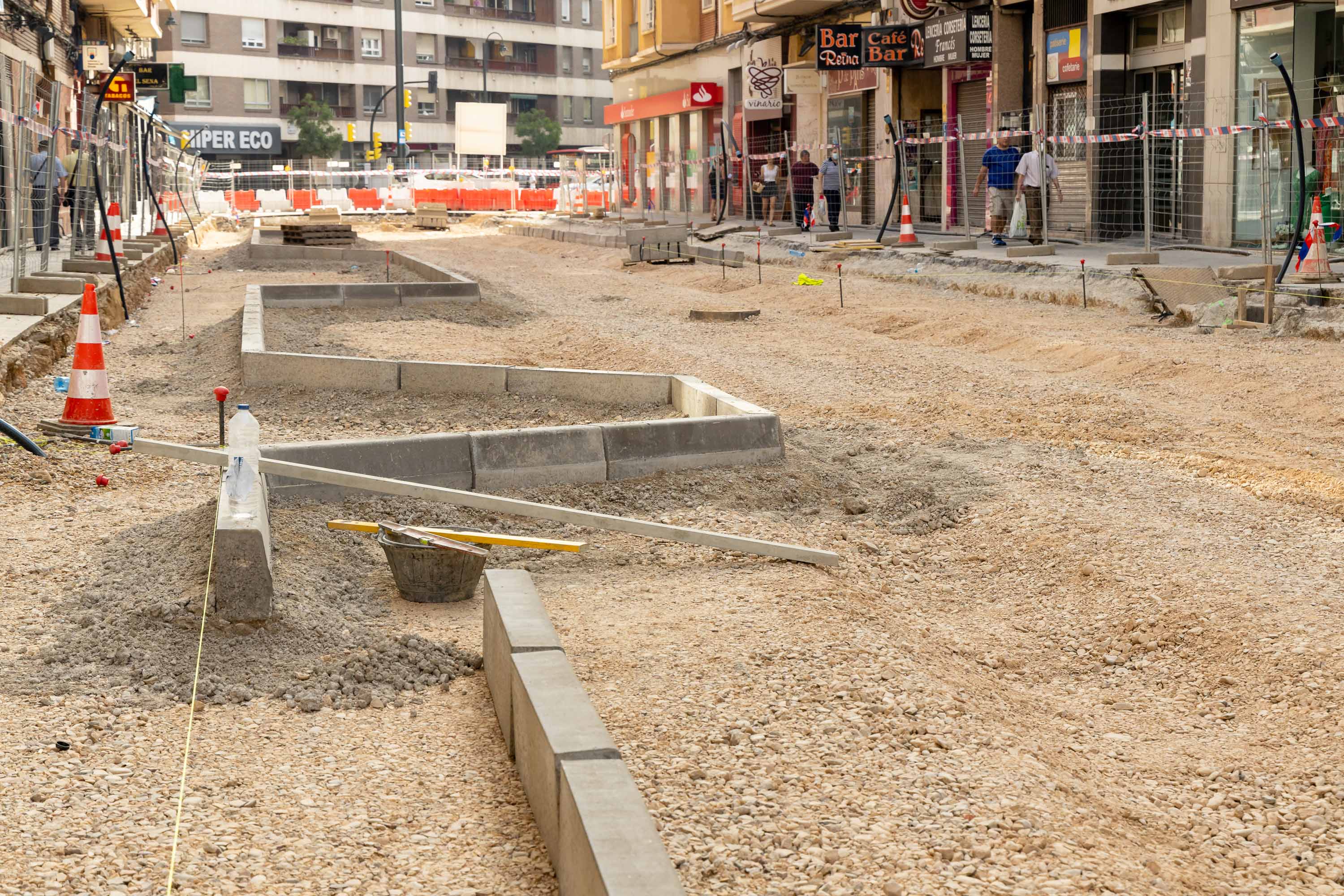 El nuevo diseño de la calle Reina Fabiola, en San José, comienza a tomar forma. Una vez renovadas las conducciones de saneamiento y casi todas las de agua de la primera fase, la más próxima a Miguel Servet, la sociedad municipal Ecociudad está ejecutando la nueva configuración que permitirá crear aceras más anchas y una banda con arbolado y bancos.