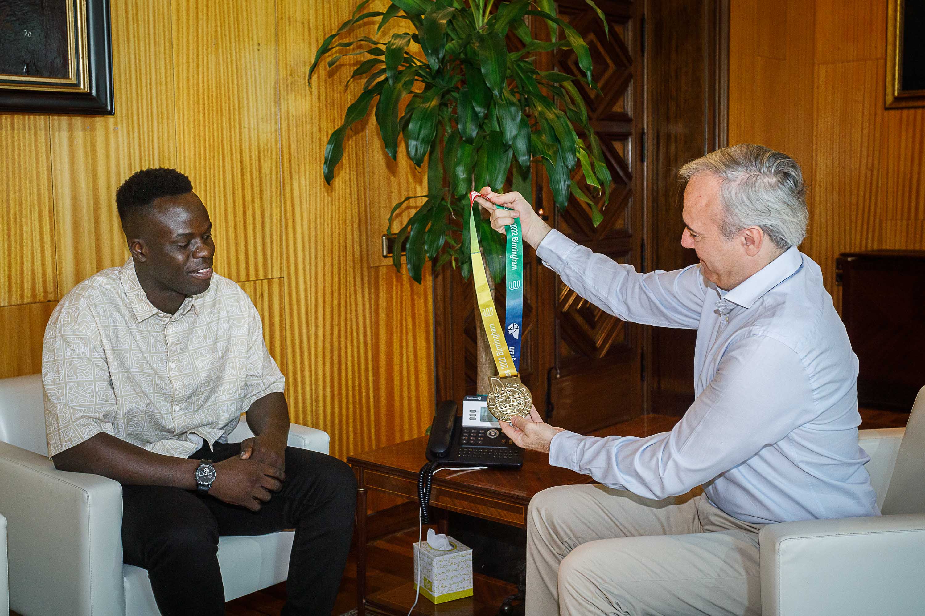 El alcalde Jorge Azcón recibe al karateca zaragozano Babacar Seck, campeón en los Juegos Mundiales