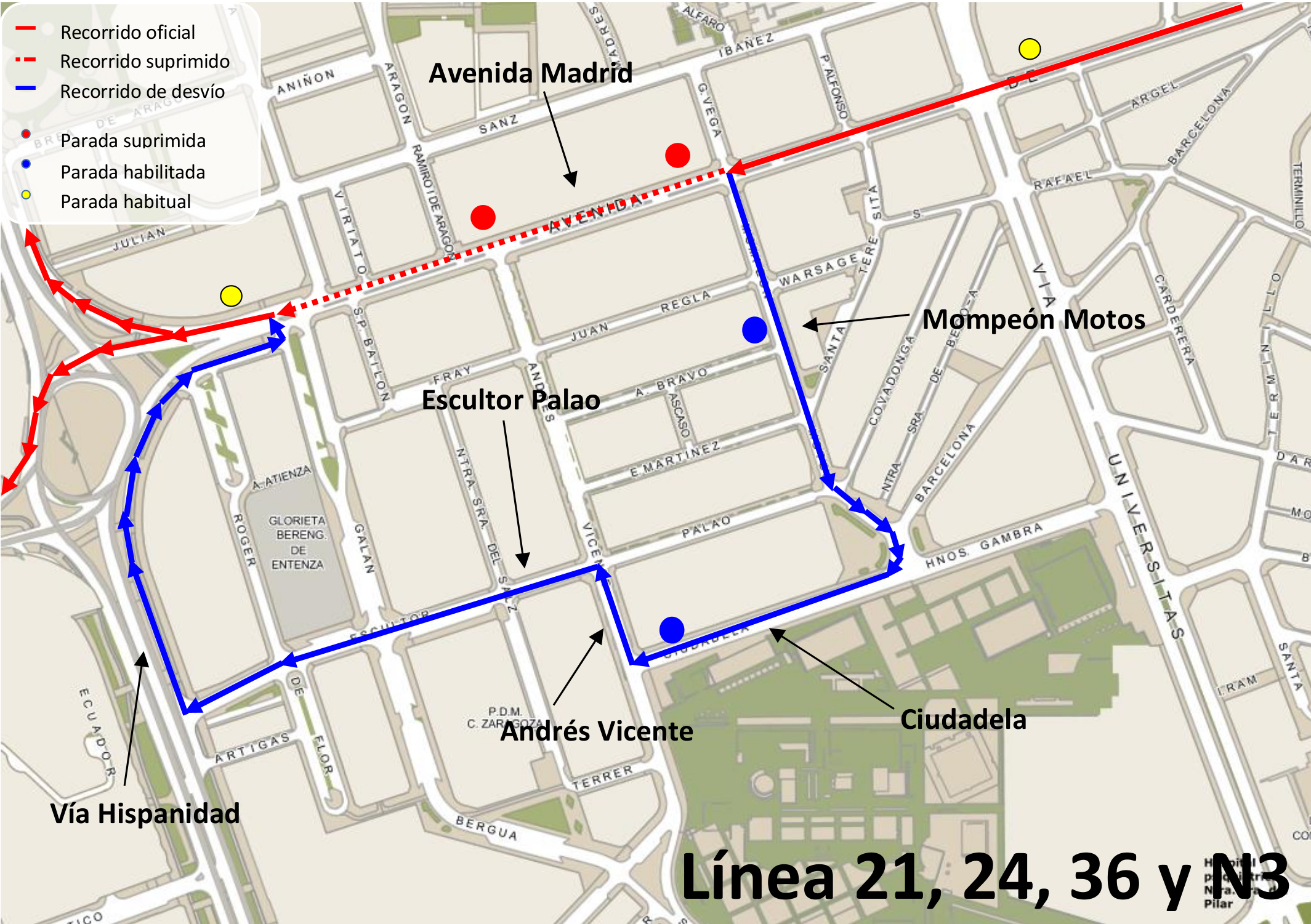 El corte afectará a cinco líneas de autobús, que verán modificado su recorrido: 21, 24, 33, 36 y N3. que circularán desviadas por Mompeón Motos (se adjuntan planos de desvíos).