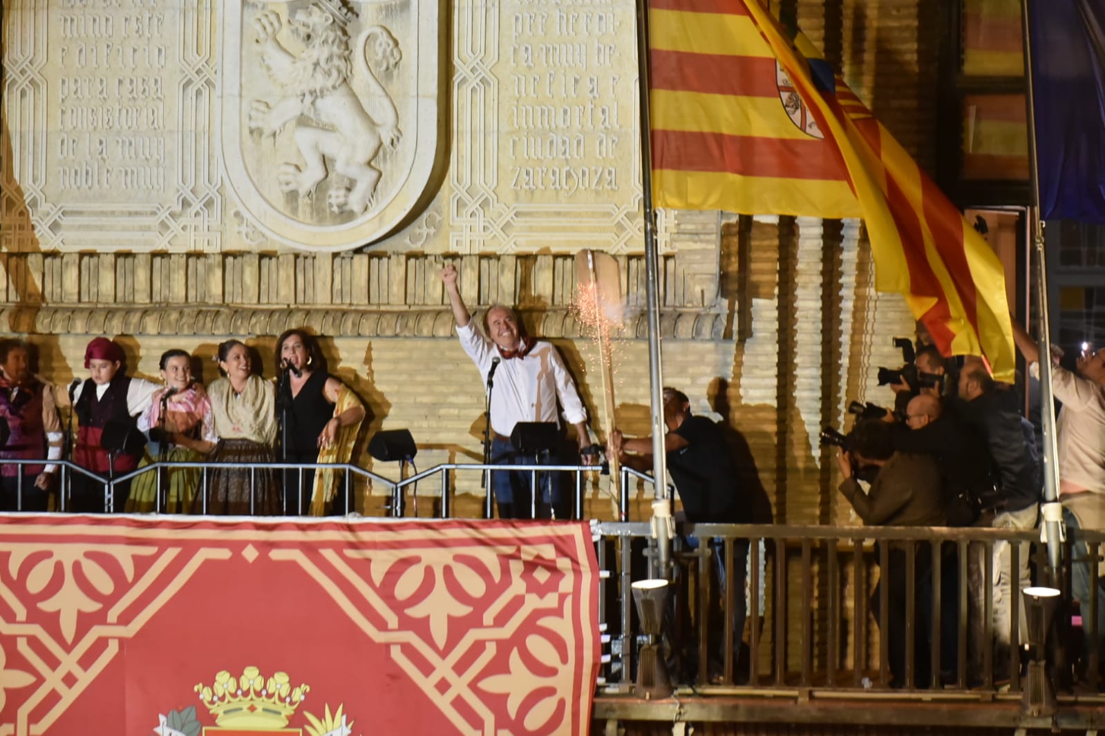 Los cuatro joteros se han dirigido, desde el balcón del Ayuntamiento, al numeroso público que ha acudido a la Plaza del Pilar para presenciar el pistolezado de salida de las Fiestas del Pilar, acto que ha arrancado con la jota S’ha feito de nuey.Los cuatro joteros han dado lectura al pregón, iniciándolo con su presentación “soy la jota aragonesa y llevo acompañándoos toda la vida. Me siento muy orgullosa por tanto de ser aragonesa, y me habéis hecho el honor de bailarme y cantarme en todo Aragón, desde las montañas de Echo y Ansó, desde el último rincón del Pirineo, hasta los pueblos más al sur de nuestro querido Teruel. Y desde luego aquí, en Zaragoza, donde tanto cariño me habéis dado siempre y donde decidistéis bilarme veloz y enérgicamente, don frenético desparpajo”.