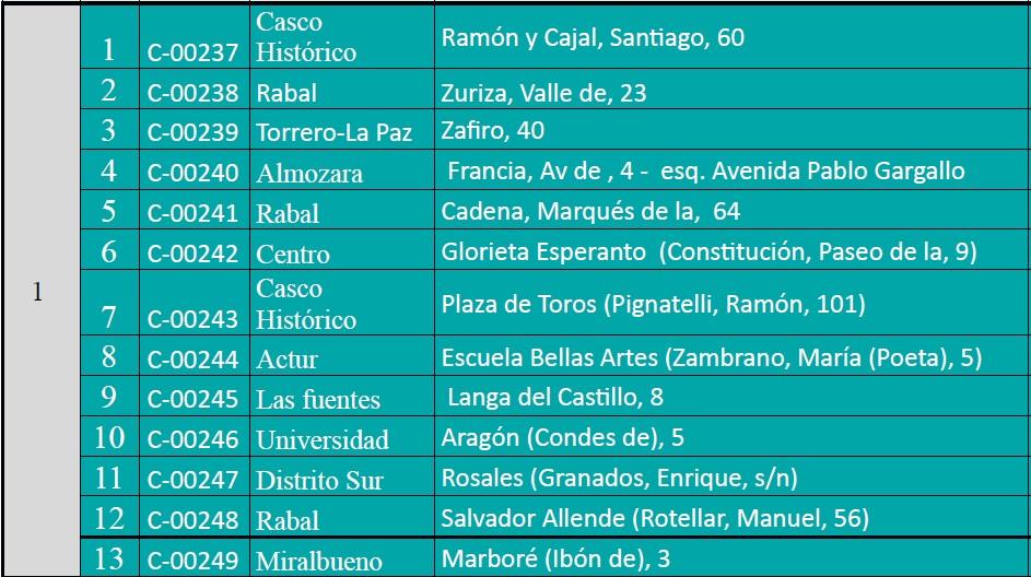 El Lote 1, con 13 ubicaciones y 54 plazas, que gestionaría Endesa X, incluye puntos de recarga en Casco Histórico, Rabal, Torrero-La Paz, Almozara, Rabal, Centro, Actur, Las Fuentes, Universidad, Distrito Sur y Miralbueno.