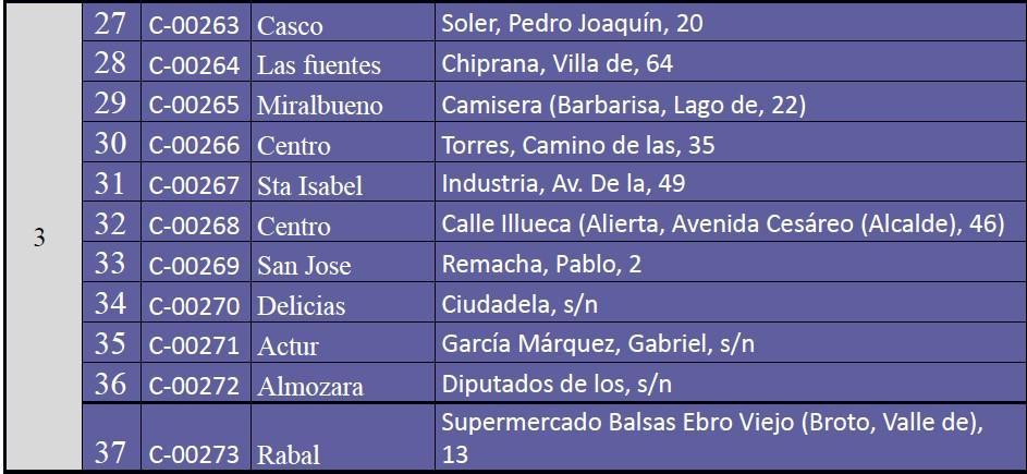 Finamente, el Lote 3, con 11 puntos de recarga y 46 plazas, de la UTE E-Gedesel-Gonzalvo, tendrá estaciones en Casco Histórico, Las Fuentes, Miralbueno, Centro, Santa Isabel, Delicias, Actur, Almozara y Rabal.
