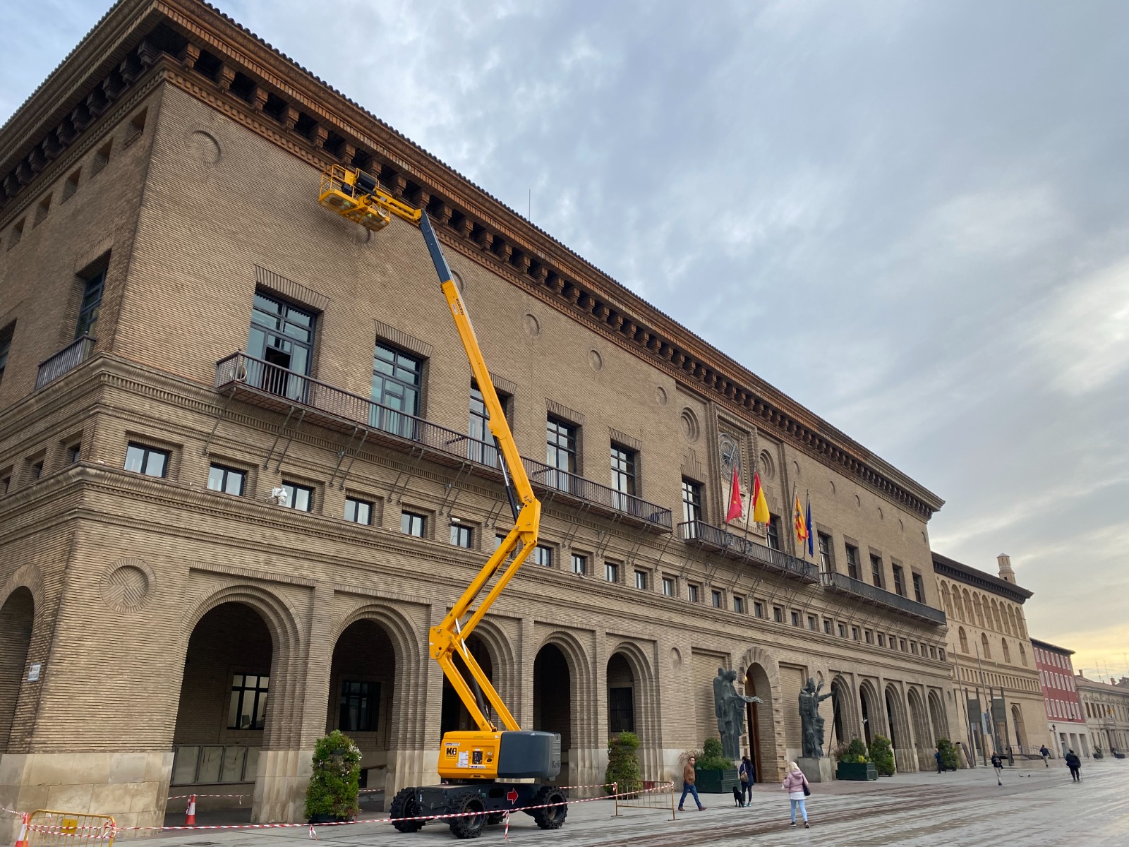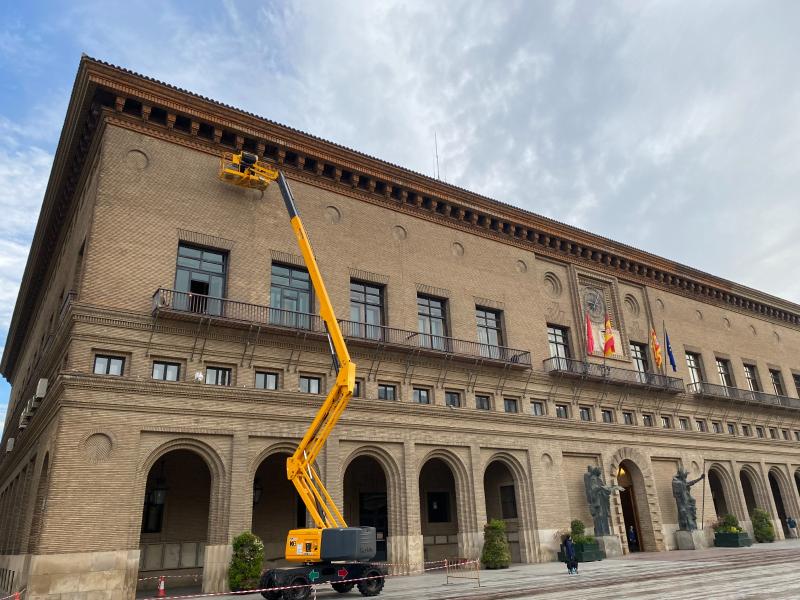 La fachada del Ayuntamiento de Zaragoza lucirá en las próximas semanas nuevo alumbrado ornamental. El área de Infraestructuras está ultimando la renovación de la iluminación exterior de la Casa Consistorial para mejorar su eficiencia energética, ahorrar en la factura eléctrica y realzar el edificio.