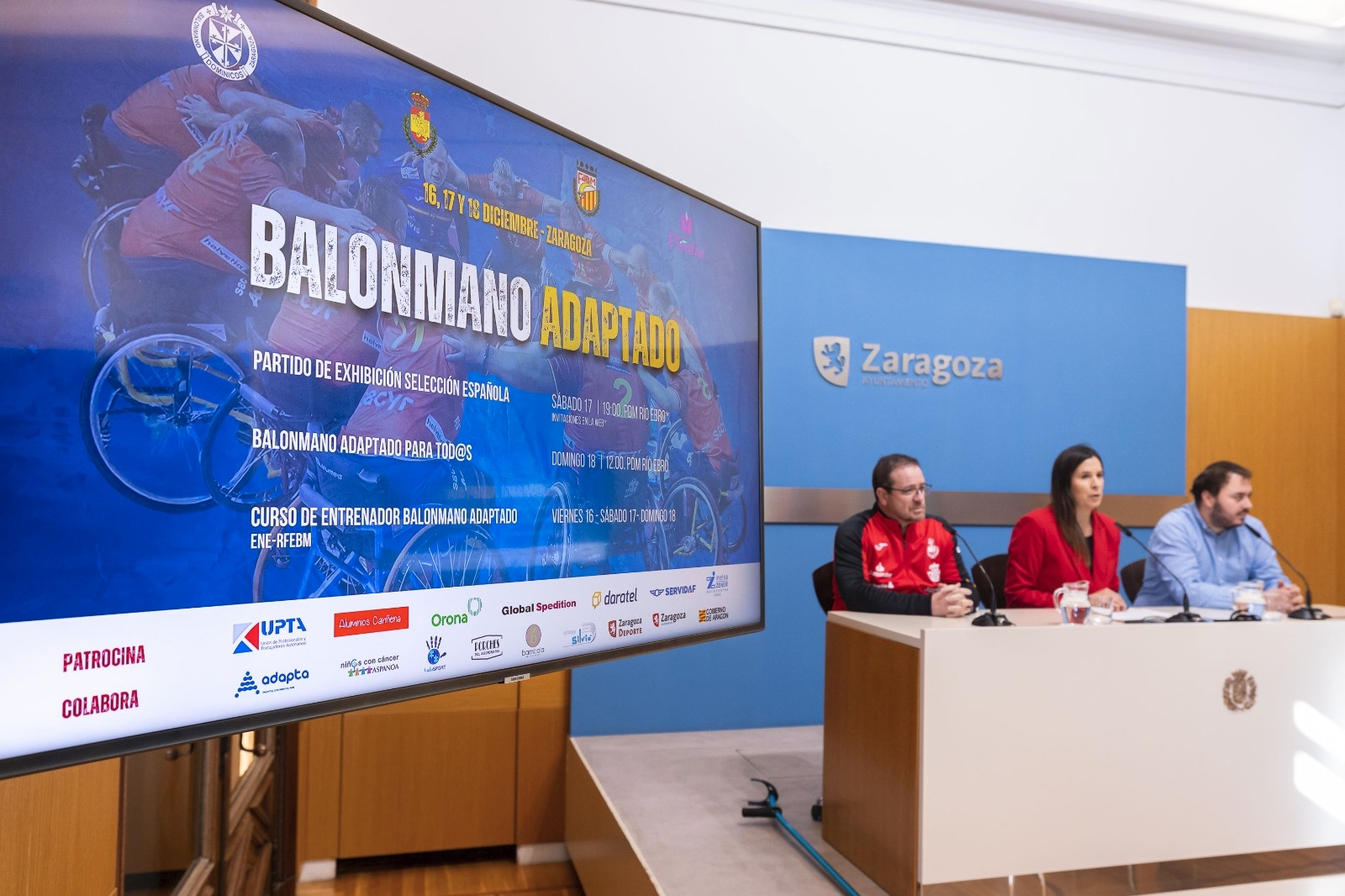 Zaragoza celebra este fin de semana, del 16 al 18 de diciembre, la I Jornada de Balonmano Adaptado. Un evento nacional sin precedentes que hoy ha sido presentado en el Ayuntamiento por la concejala delegada de Deportes, Cristina García, el director general de Balonmano Dominicos, Carlos Langarita, y el seleccionador nacional de Balonmano Adaptado, Ricardo Alonso.