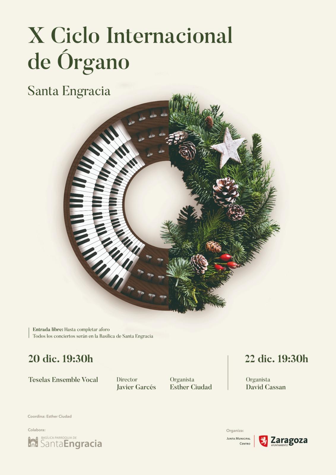 El X Ciclo Internacional de Órgano se celebrará en Santa Engracia los próximos 20 y 22 de diciembre. El Ayuntamiento de Zaragoza, a través de la Junta Municipal del Distrito Centro, impulsa una nueva edición del Ciclo Internacional de Órgano que se celebra en la Basílica de Santa Engracia. La entrada a ambos conciertos será libre hasta completar el aforo.
